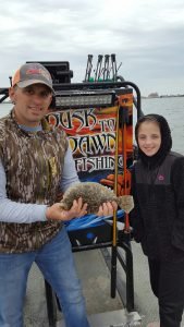 Captain Marc Spagnola of Dusk to Dawn Bowfishing left the bows in the garage for a family trip to do some flounder fishing. Captain Marc put his daughter Alayna on her first fish of the season when she caught this flounder trolling Gulp swimming mullet.