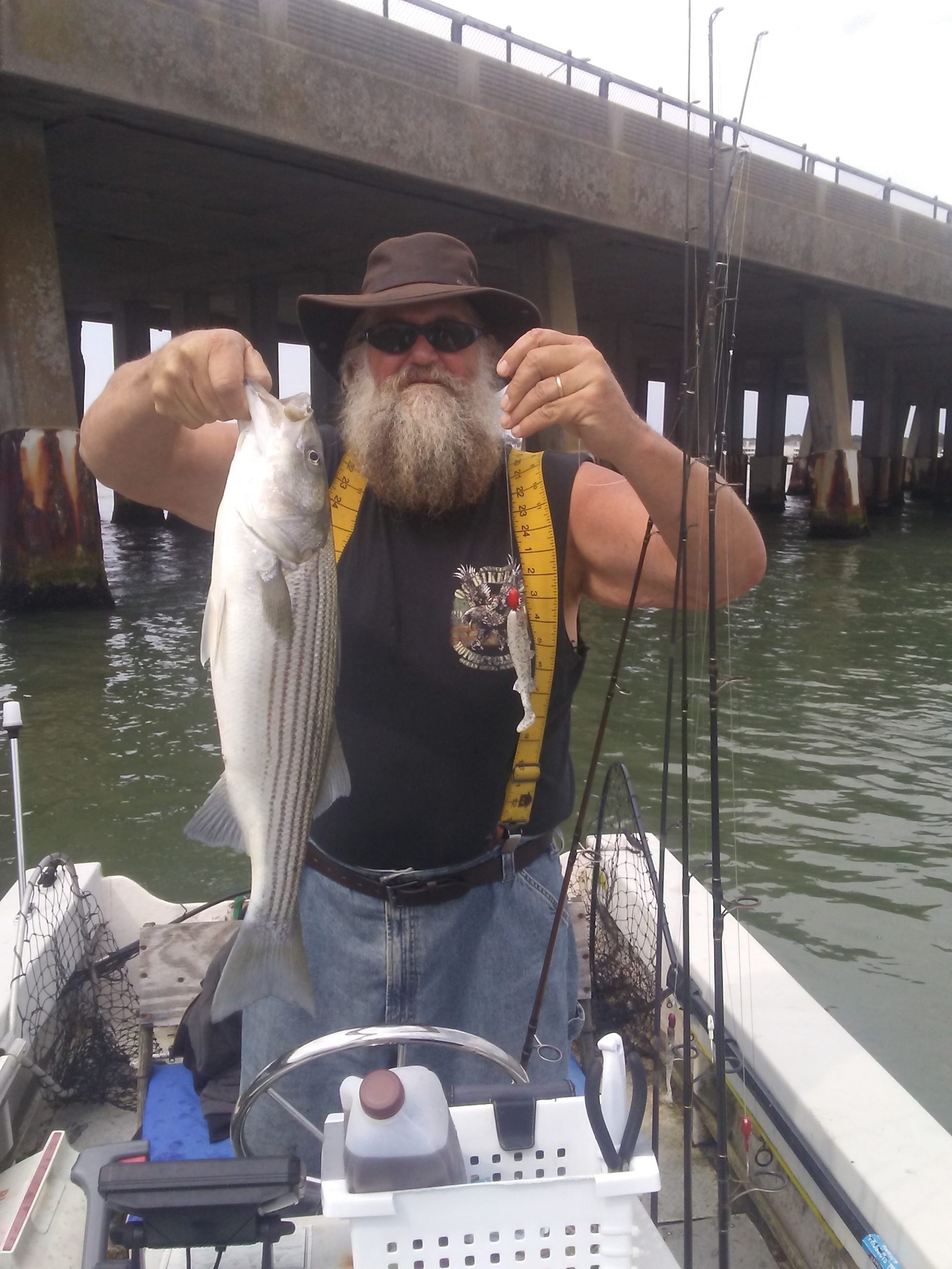 Big Bird Cropper and Birthday Boy Neighbor Dave had a great day throwing Roy Rigs at the route 50 bridge today. The guys caught and released 17 rockfish and Bird landed his first bluefish of the season.