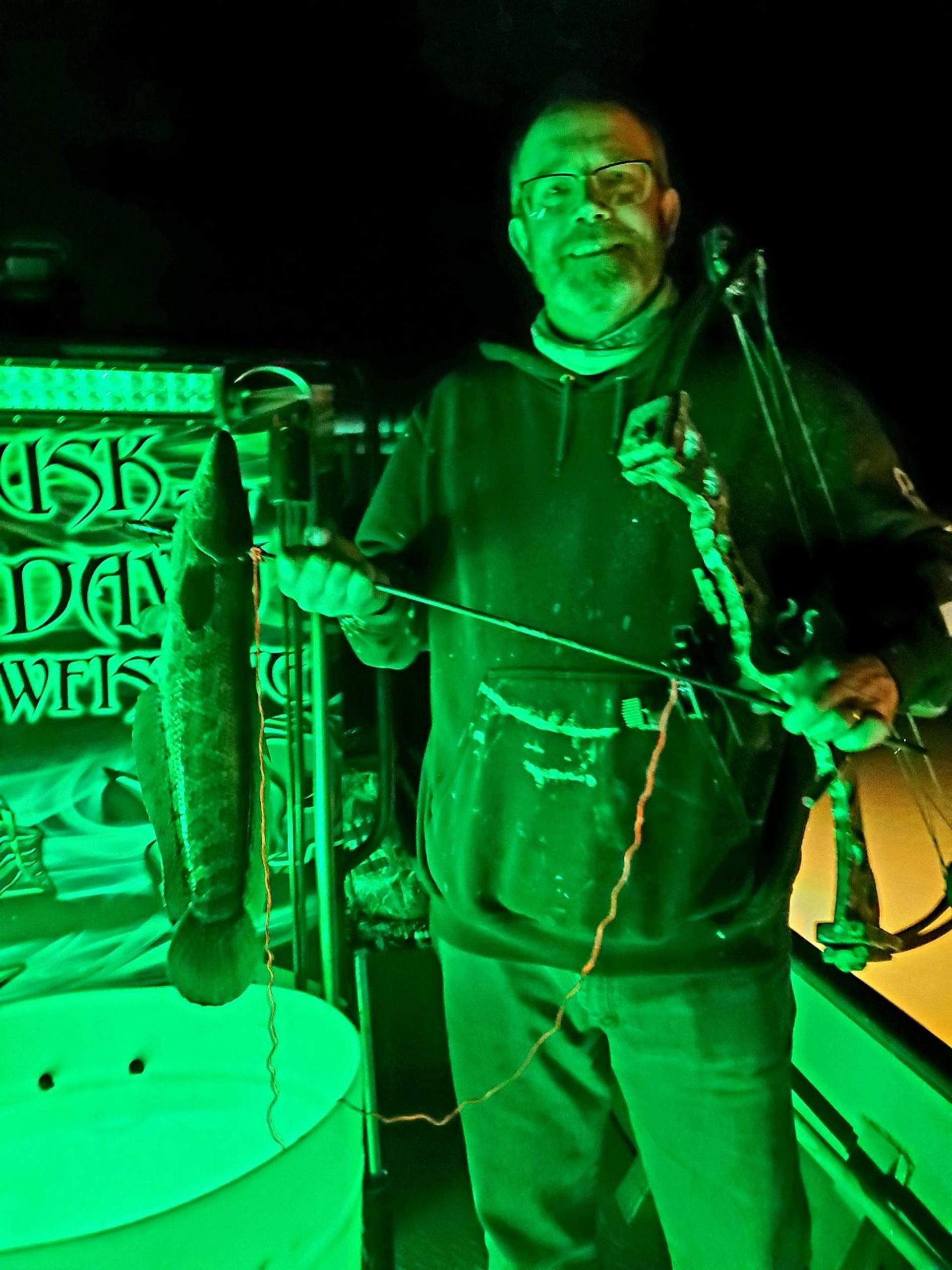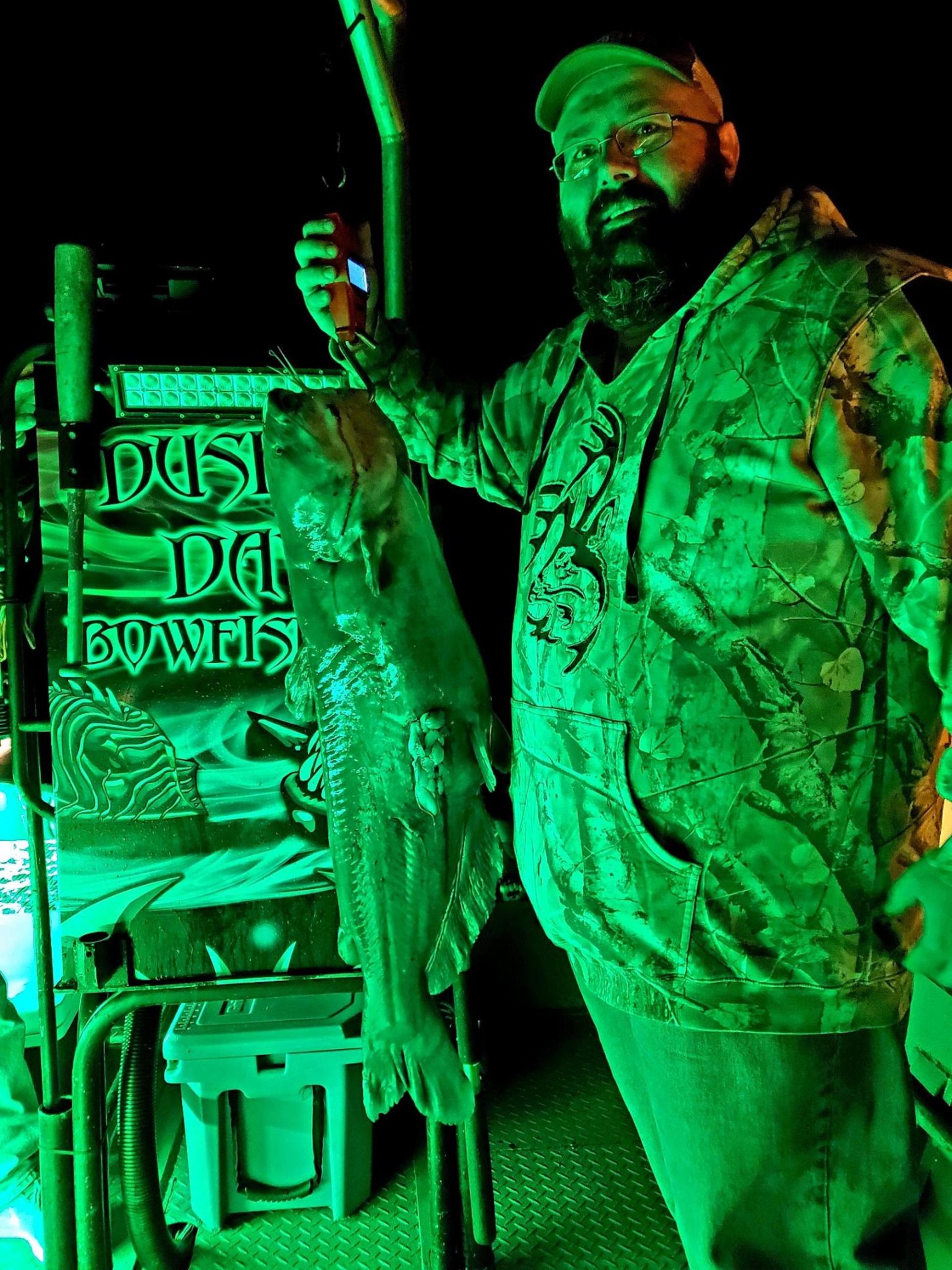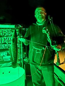 Captain Marc Spagnola of Dusk to Dawn Bowfishing was burning the midnight oil again last night and had some luck patrolling the shallows. Captain Marc put his shooters on some snakehead action and also added a BIG 35 pound blue catfish to the cooler.