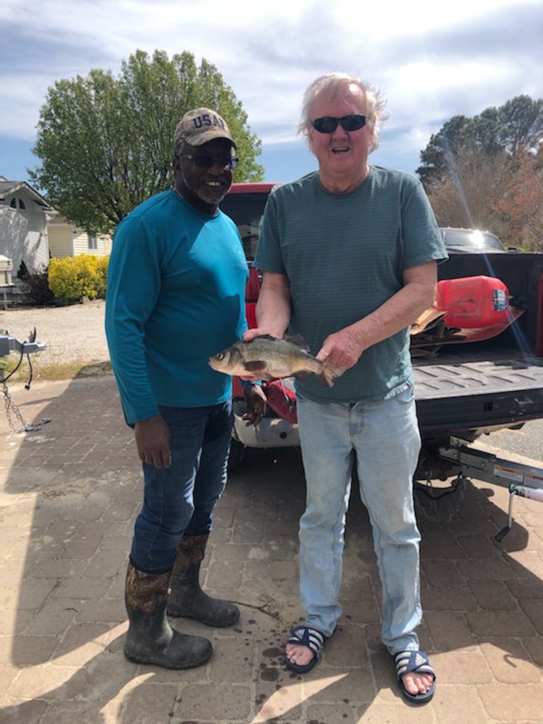 And here’s a story you don’t hear everyday….Bob Hudson was in the middle part of the bay today behind Ocean City when he noticed some fish disrupting the surface. He thought it might be rockfish so he grabbed an old cheap fishing rod that he happened to have in his boat, he tied on a Roy Rig that he was lucky enough to have with him and cast toward the commotion. Bob lost the first bite, but on the second cast he caught the mystery fish. Well it wasn’t rockfish, but it was a new state record for white perch!! That’s right, once the ink on the paperwork is dry Bob will hold the Maryland State Record for white perch with a huge 15.5″ fish that weighed 1.85 pounds! Pictured with Ben Shamburger of Felton.
