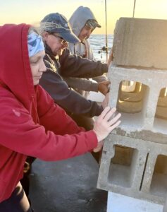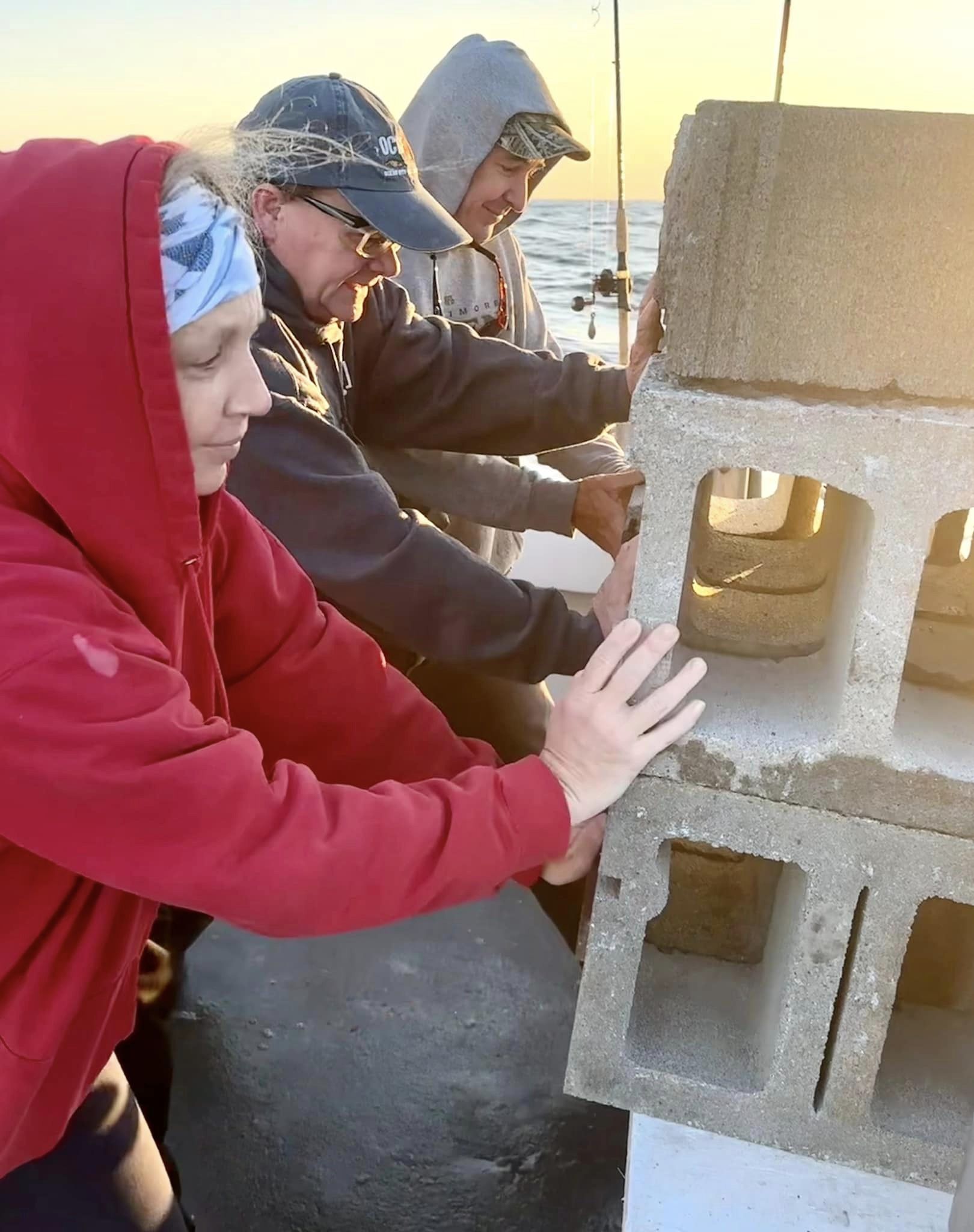 Tracy, Mark & Hurricane (who makes up for muscular force with pure Newtonian physics – jocular or not, rotundity in motion equals blocks overboard!) ..this dynamic trio made our very first block drop at Uncle Murphy’s Reef, the landing craft we sank 9 miles off just last Thursday–part of a double header – two reefs in one day. While the landing craft would fine by itself because it’s loaded with compartments where water can flow through; it will–I’ll assure anyone–become a tog mecca. By dropping a few hundred blocks and pyramids in the void where mechanized armor and troops would have been brought ashore, we’ll have have elevated the reef’s complexity further still. When building reef on a loooow budget – it’s important to make the best of each piece where able.