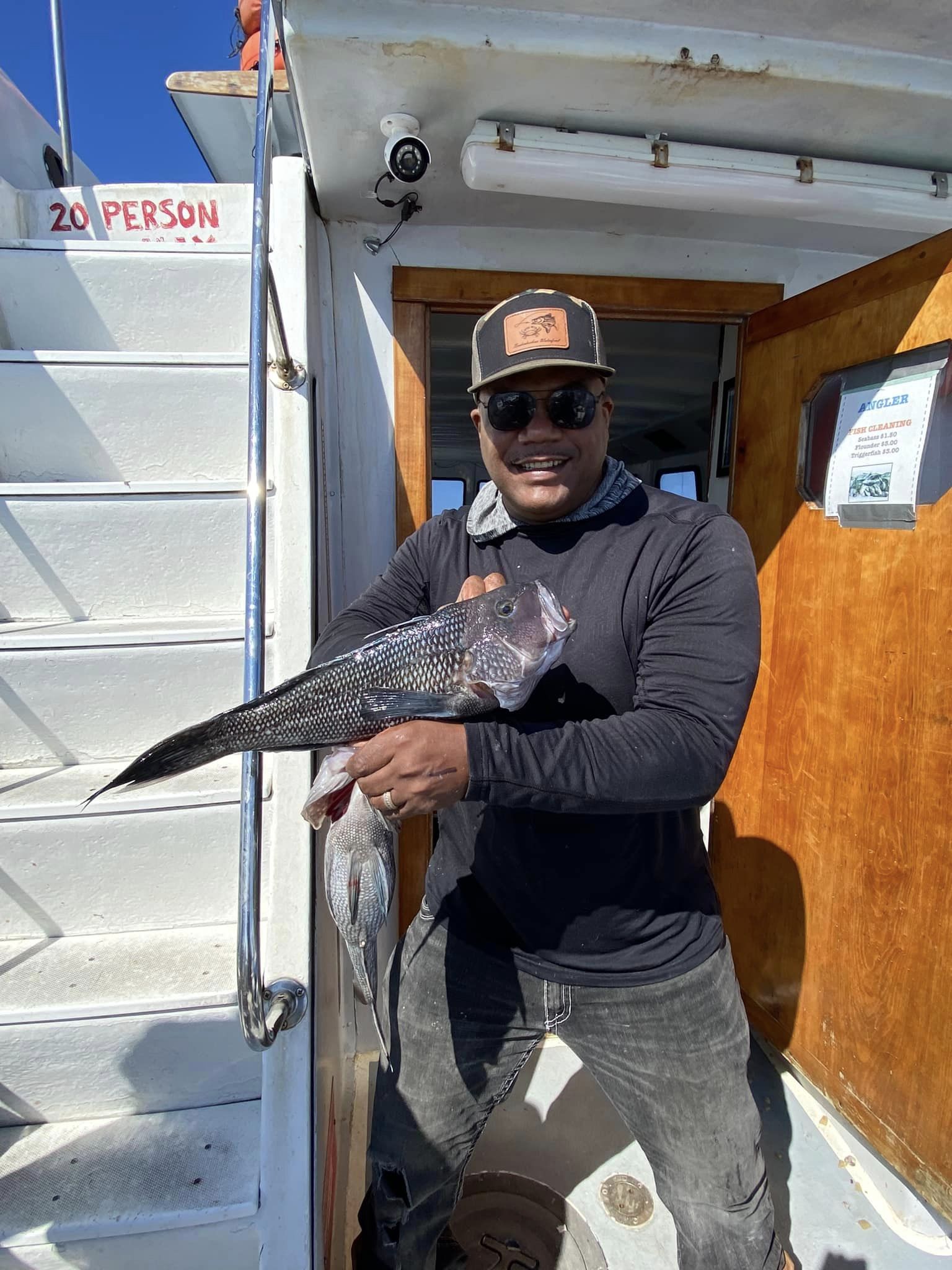 Captain Joe Schweiger, Tom Schweiger and Dillon Schweiger headed out again today and thankfully didn’t have to deal with 8 footers today while they mugged up some sea bass 20 miles off the beach.