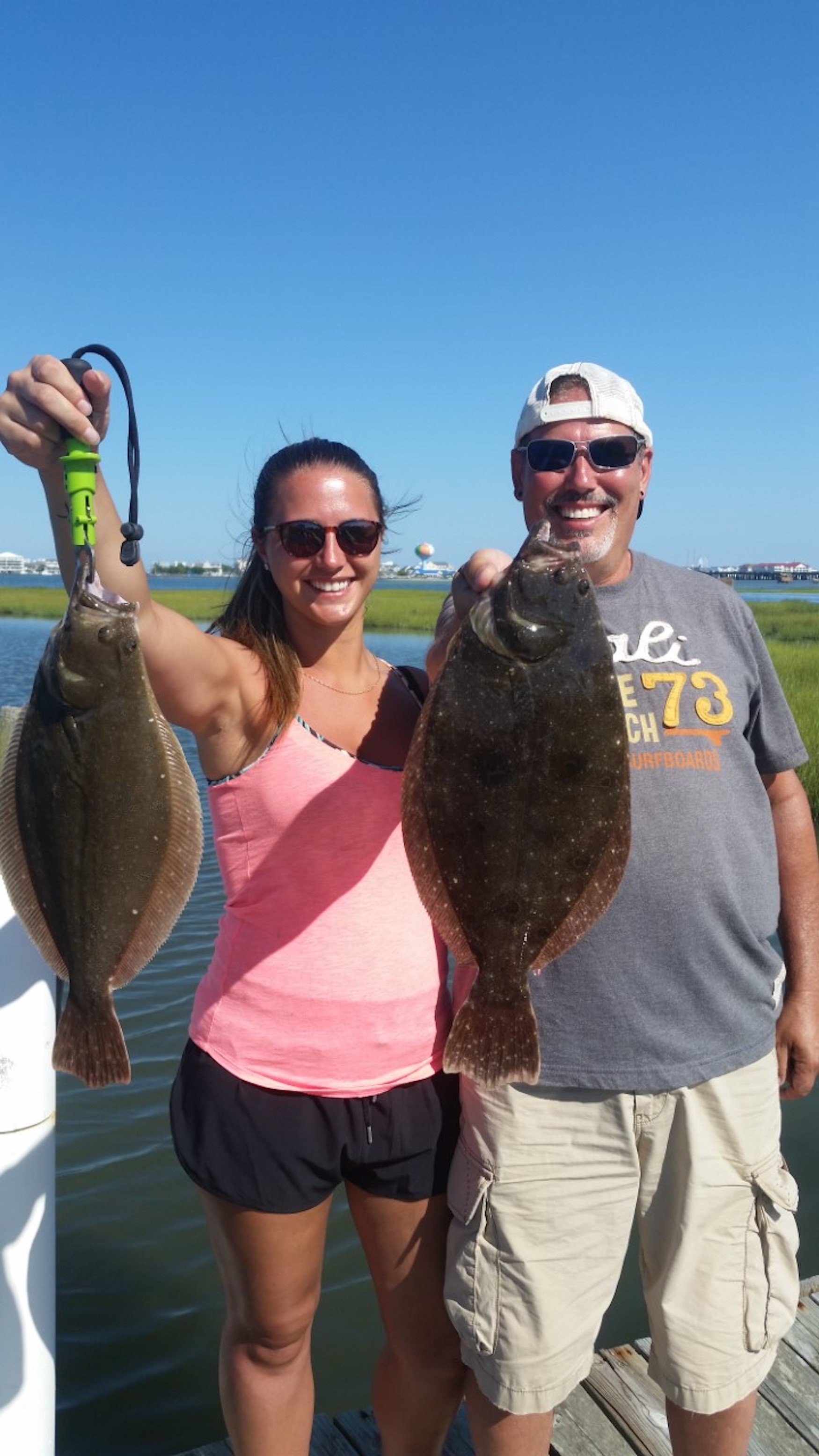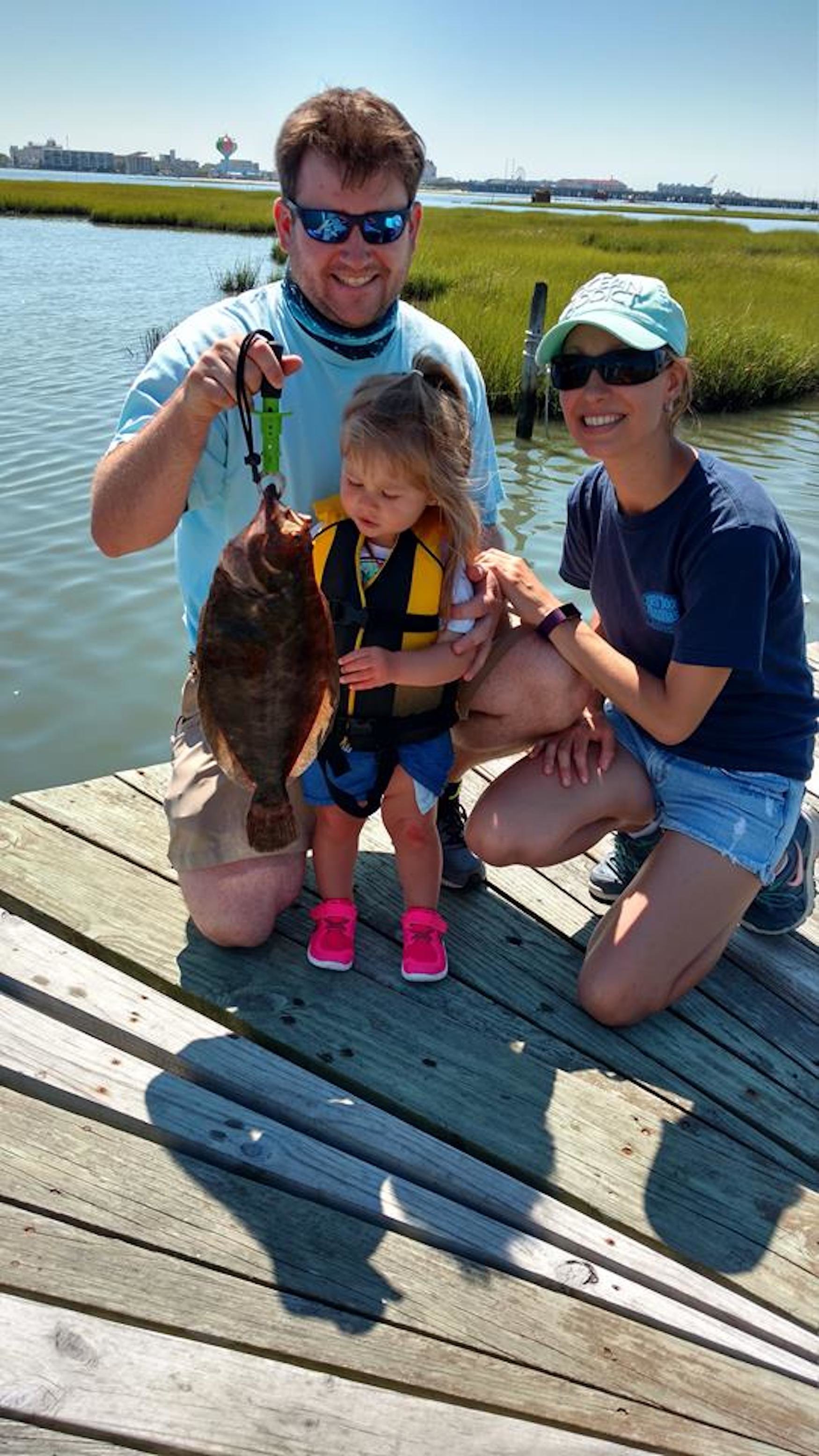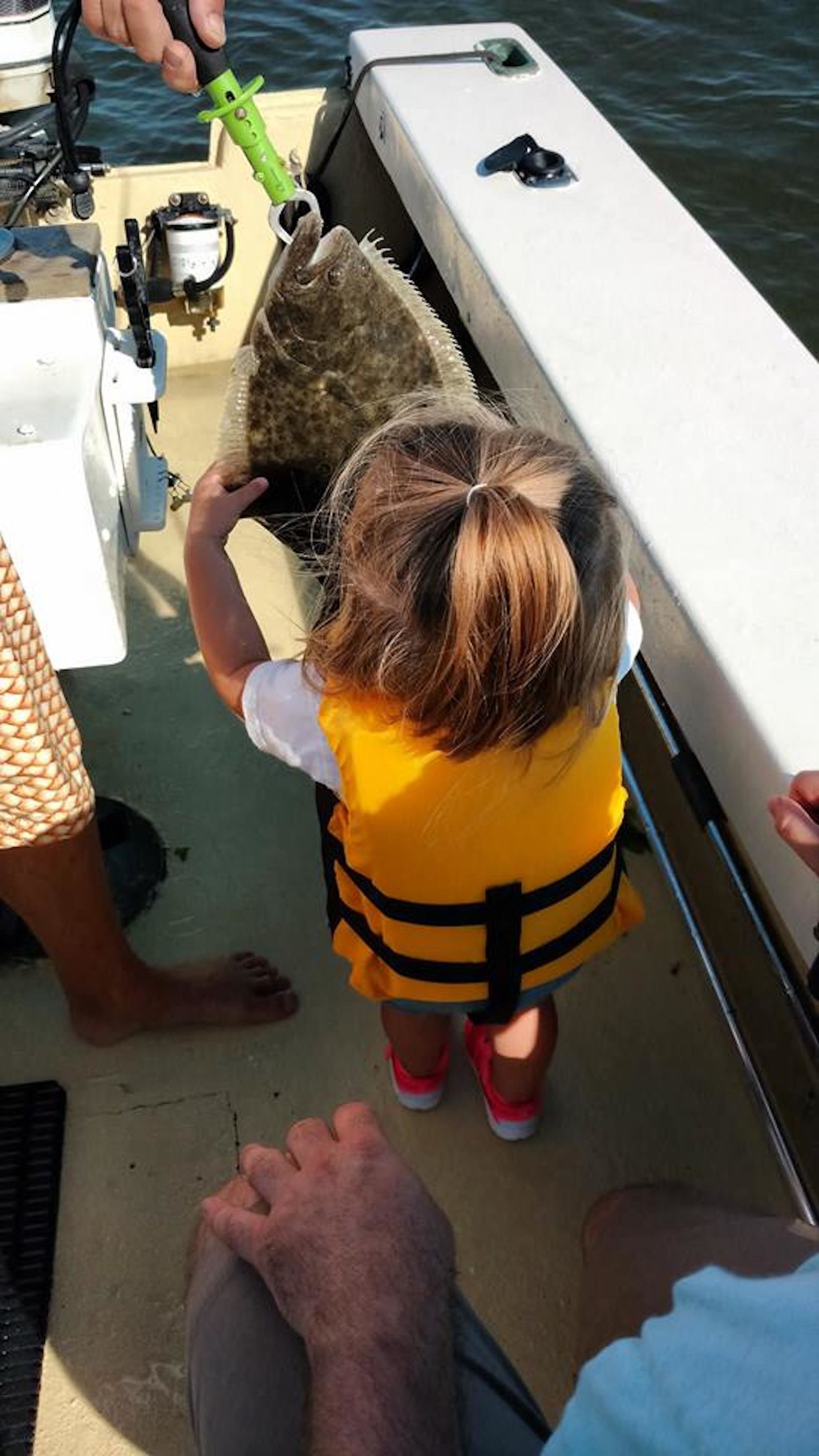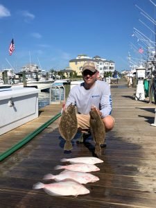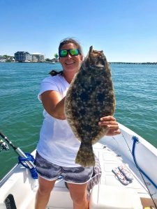 Captain Brad McCabe of Bay Time Charters put flounder in the box on two trips today. This morning Captain Brad had Justin, Courtney and young Addi May Ames out for some family fun where Addi caught her first ever flounder of 18 1/2″. This afternoon Captain Brad helped Nicole Sunday and Karl Bailey find two keepers up to 18″.