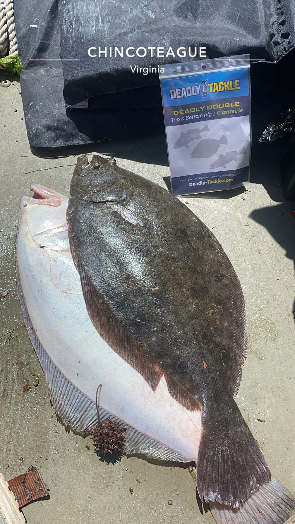 Josh Schafer was fishing down Chincoteague, VA way and had some luck putting a couple of keeper flounder in the cooler. These two keepers of 17 1/2″ and 18″ ate Deadly Tackle Deadly Double’s in chartreuse.