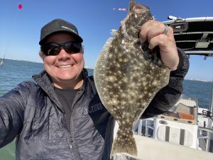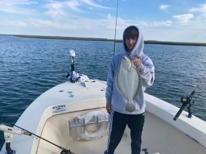 Today was a beautiful warm, sunny day, but man did the wind blow up this afternoon. I had some work to catch up on this am and the plan was to fuel up the Fish in OC skiff and do a little flounder / rock fishing, but when the wind started to crank out of the southwest I almost canned the idea. I’m reel glad I didn’t.
