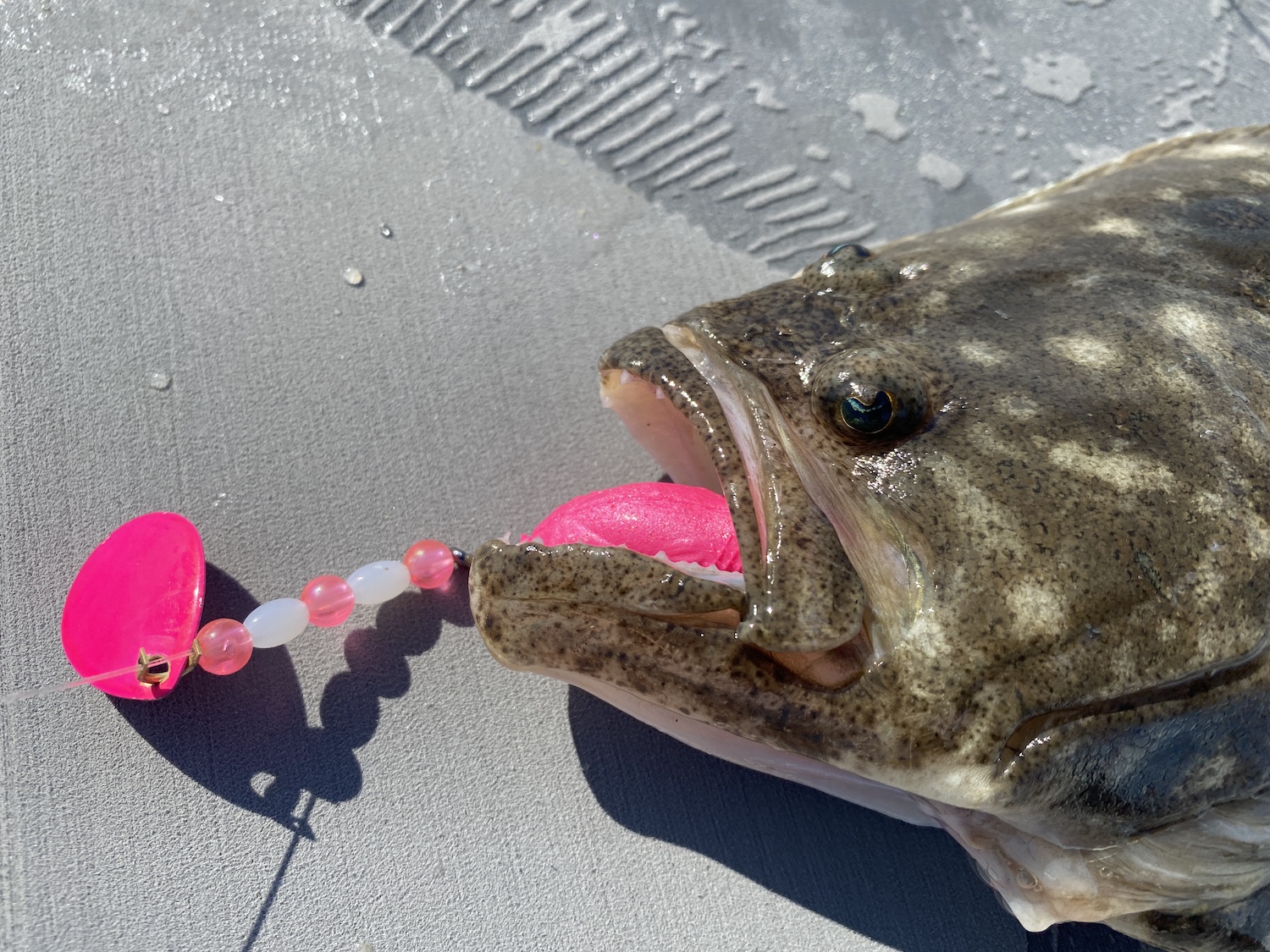 I hit the Thorofare this afternoon and caught the last of the incoming tide and since the wind was out of the south it made for a pretty fast drift. I was still able to hold bottom with 2 ounces of lead so I tied a couple of Deadly Doubles on and gave it a shot. I was pleasantly surprised by my first flounder bite of the season here in Ocean City (caught a few last week in Wachapreague) and it ended up being a nice keeper at 17 1/2″. The first fish ate the pink Deadly Double baited with a 4″ pink Gulp swimming mullet and was in 8′ of water. I caught three more throwbacks from between 15″ and just under 16 1/2″ and all of them were on the chartreuse Deadly Double baited with white Gulp. The water temp was 55 degrees where I was fishing and I even missed another bite while the rod was in the rod holder. It was certainly an encouraging trip so I’ll be heading back out there over the next several weeks looking for more.