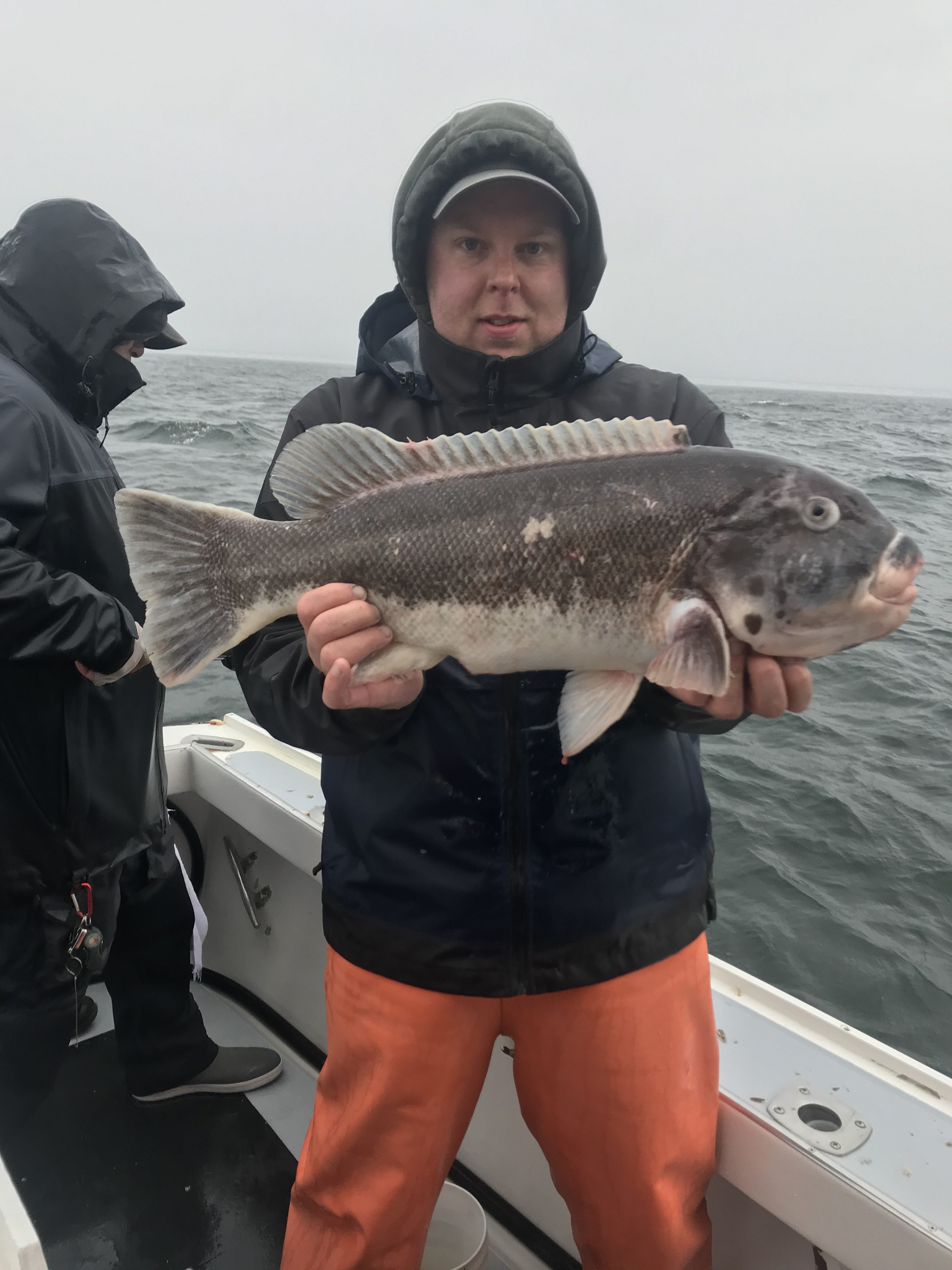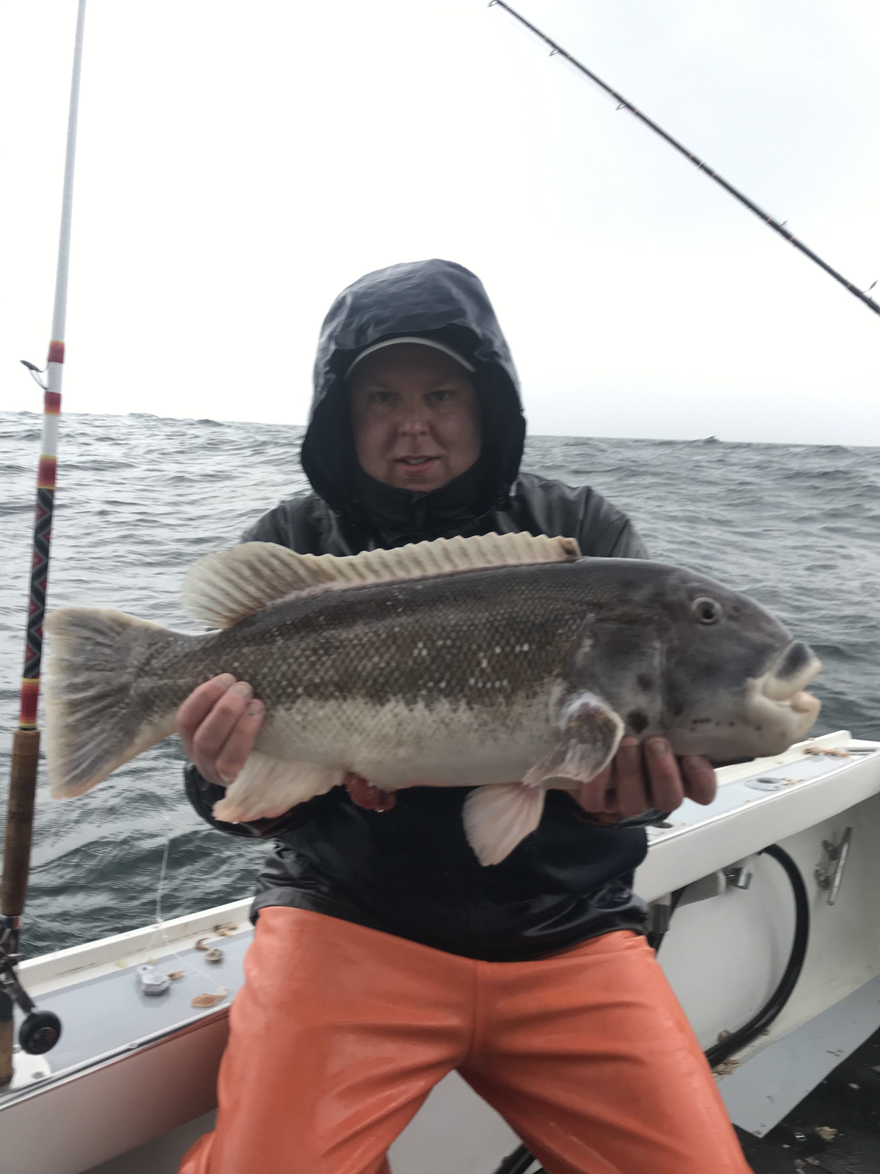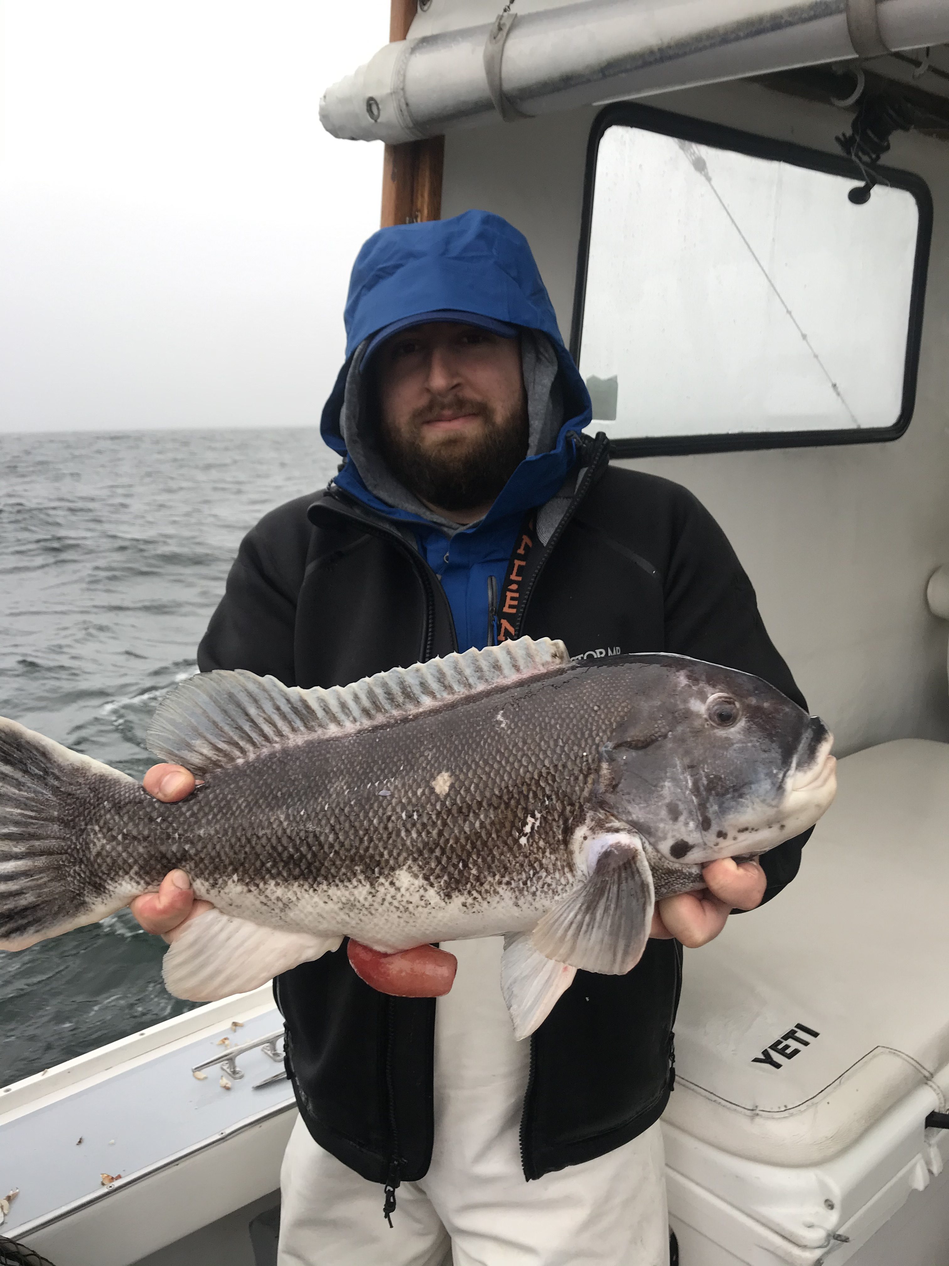 Pretty crappy day overall in and around town today with intermittent rain and fog, but the wind did lay down a little making it not as bad as it could have been. It gave Captain Kane Bounds an opportunity to get out to the fishing grounds and put some tautog in the box.