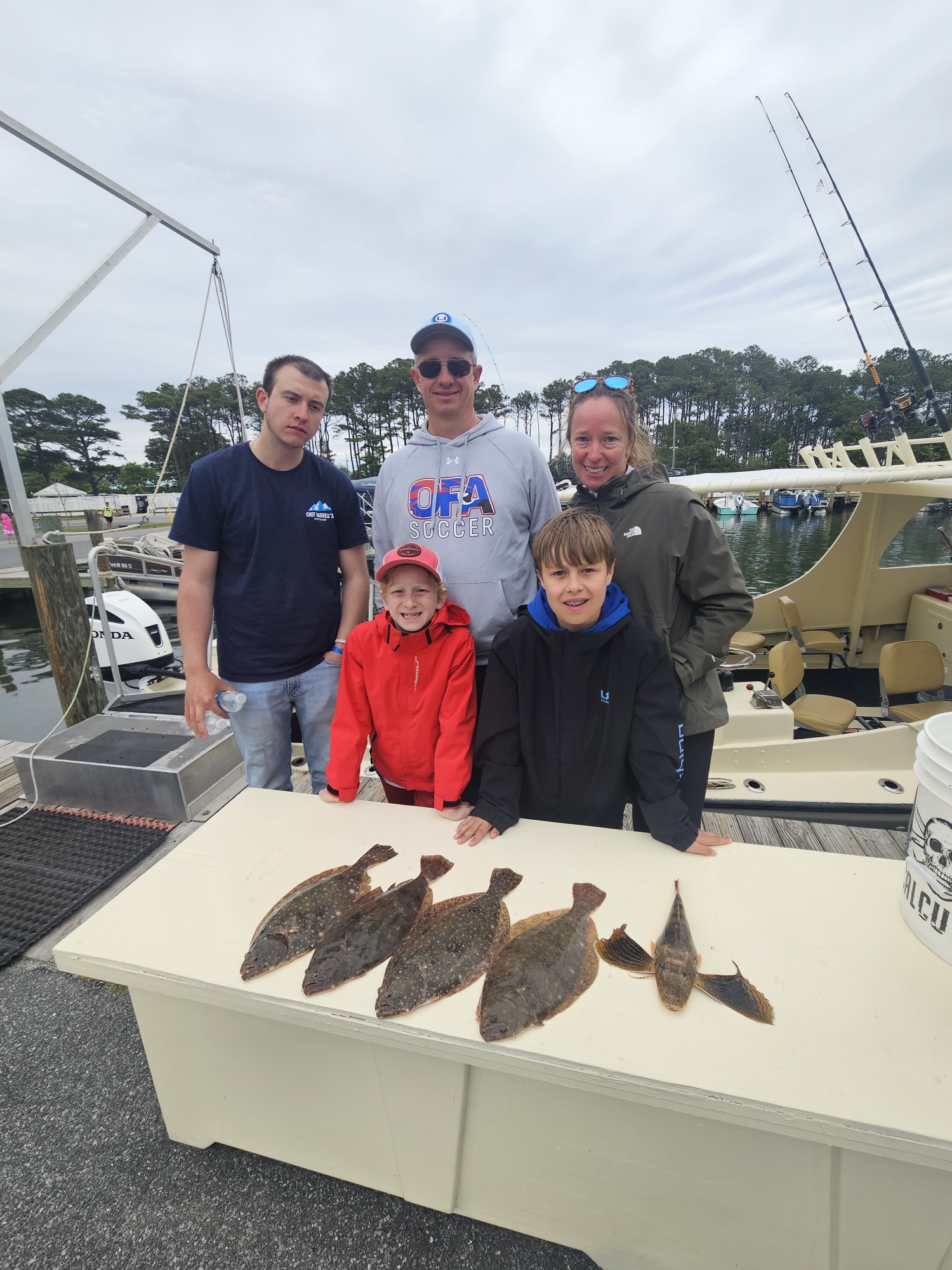 Captain Jason Mumford of Lucky Break Charters had a good trip this morning before the storms with four keeper flounder and a big sea robin for his folks.