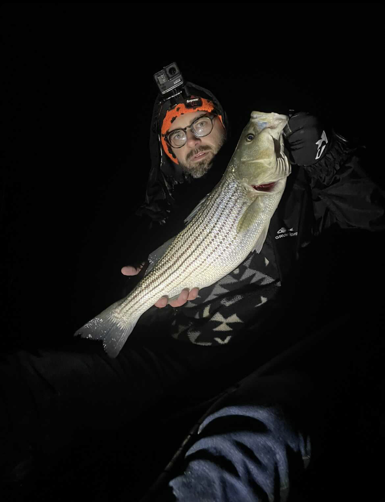Taylor Bakke fished the Verrazano bridge last night in his kayak and caught and released this 25” rockfish.