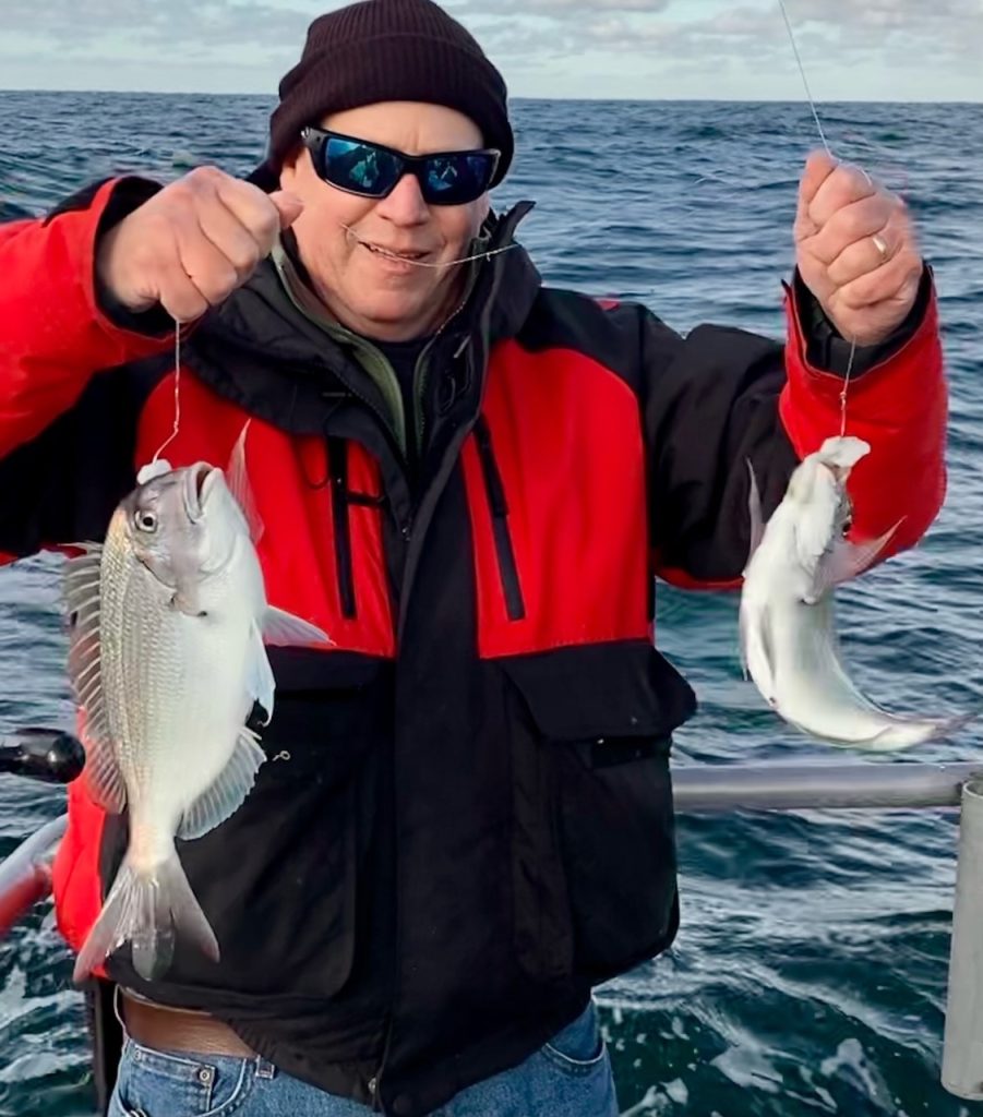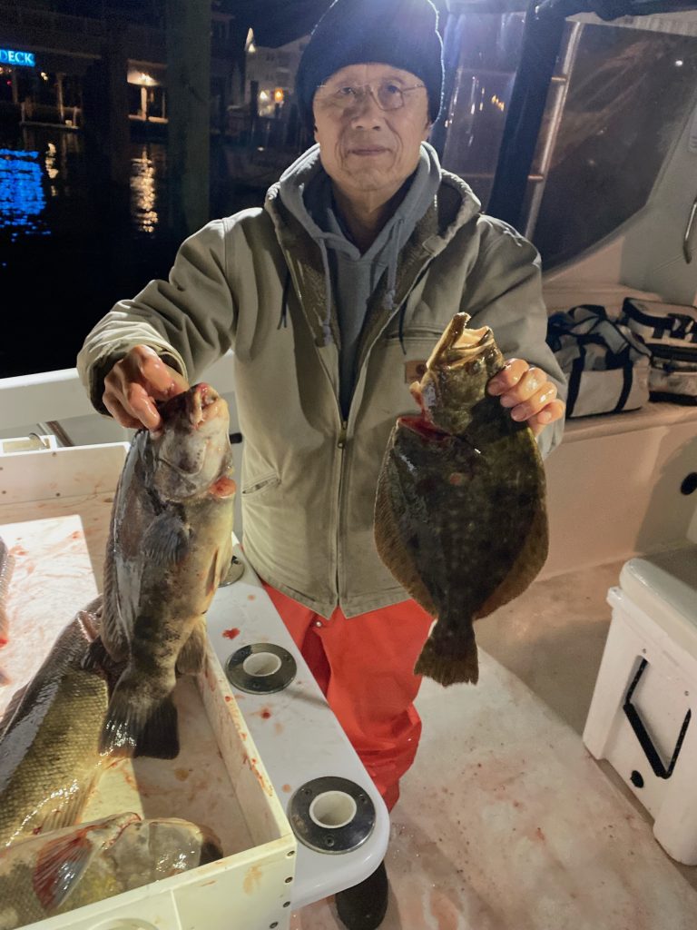 Captain Chase Eberle of Chasin’ Tides Charters was in tautog mode today and even though his crew needed over a pound of lead to hold bottom they had 18 keeper tog up to 13 pounds, three sea bass and even a flounder.
