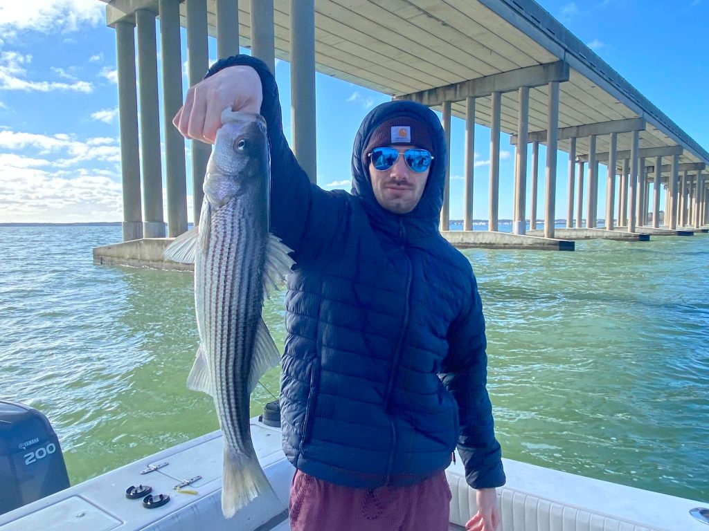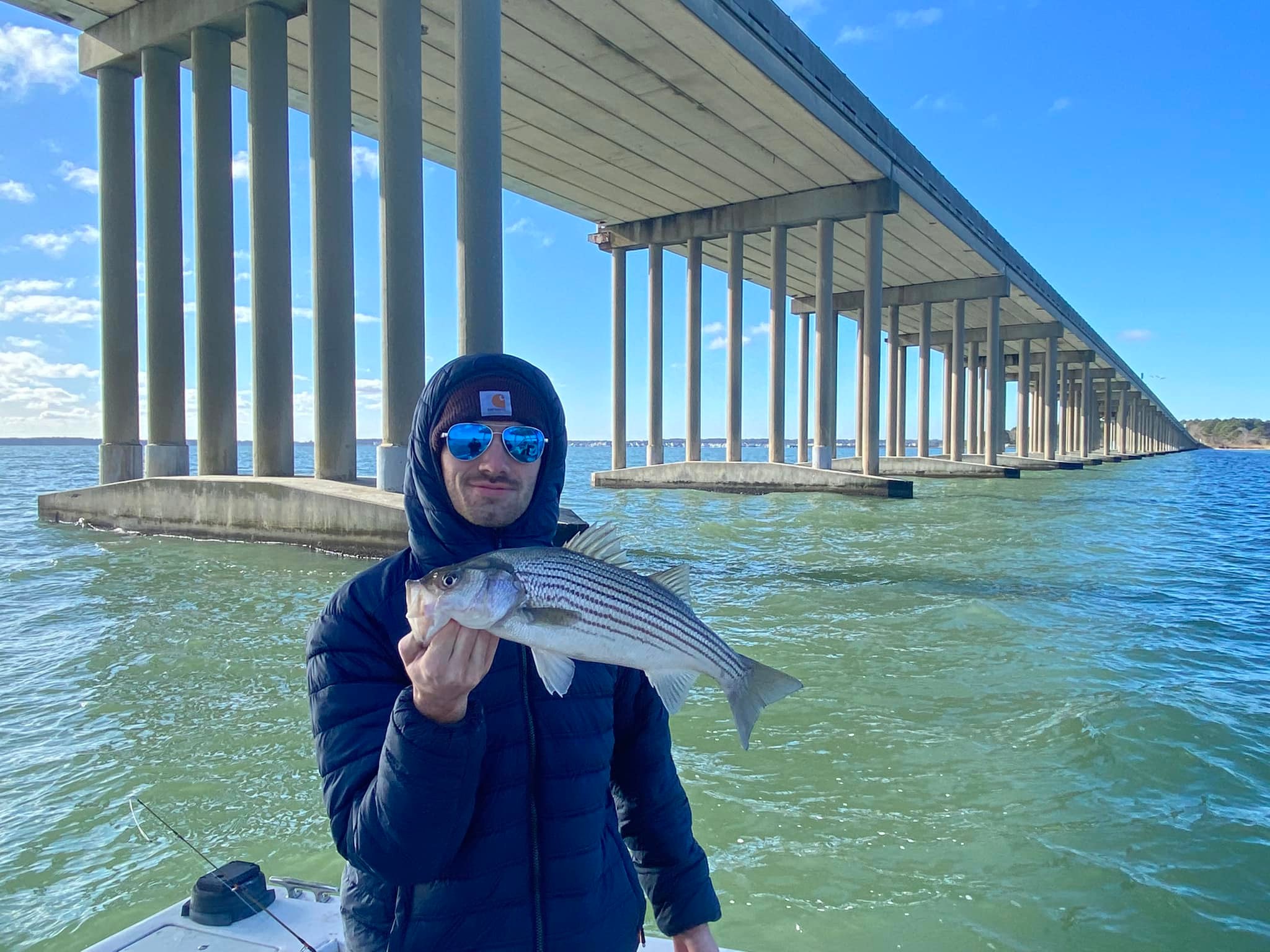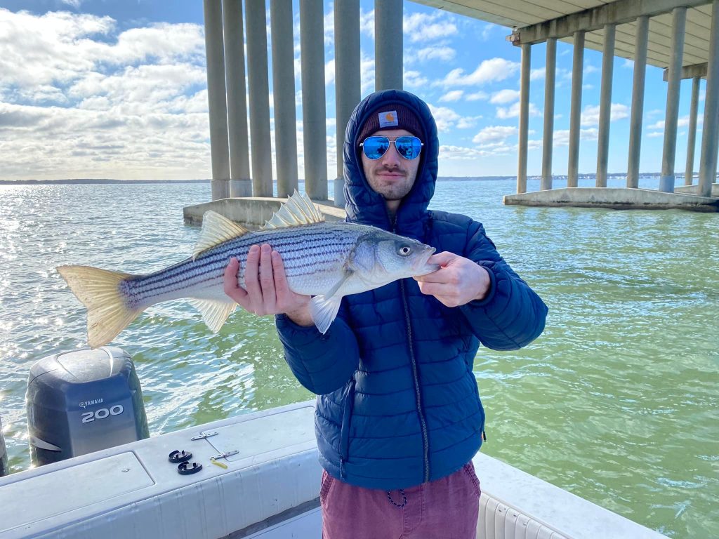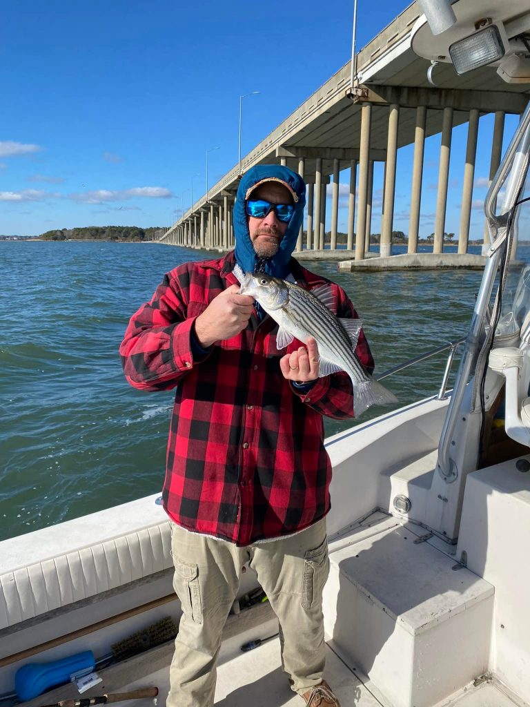 Bryan Mindte of Sunset Provisions had his son and favorite fishing buddy Caleb on board today for some catch and release rockfish at the route 90 bridge. The guys caught several fish up to 23″.