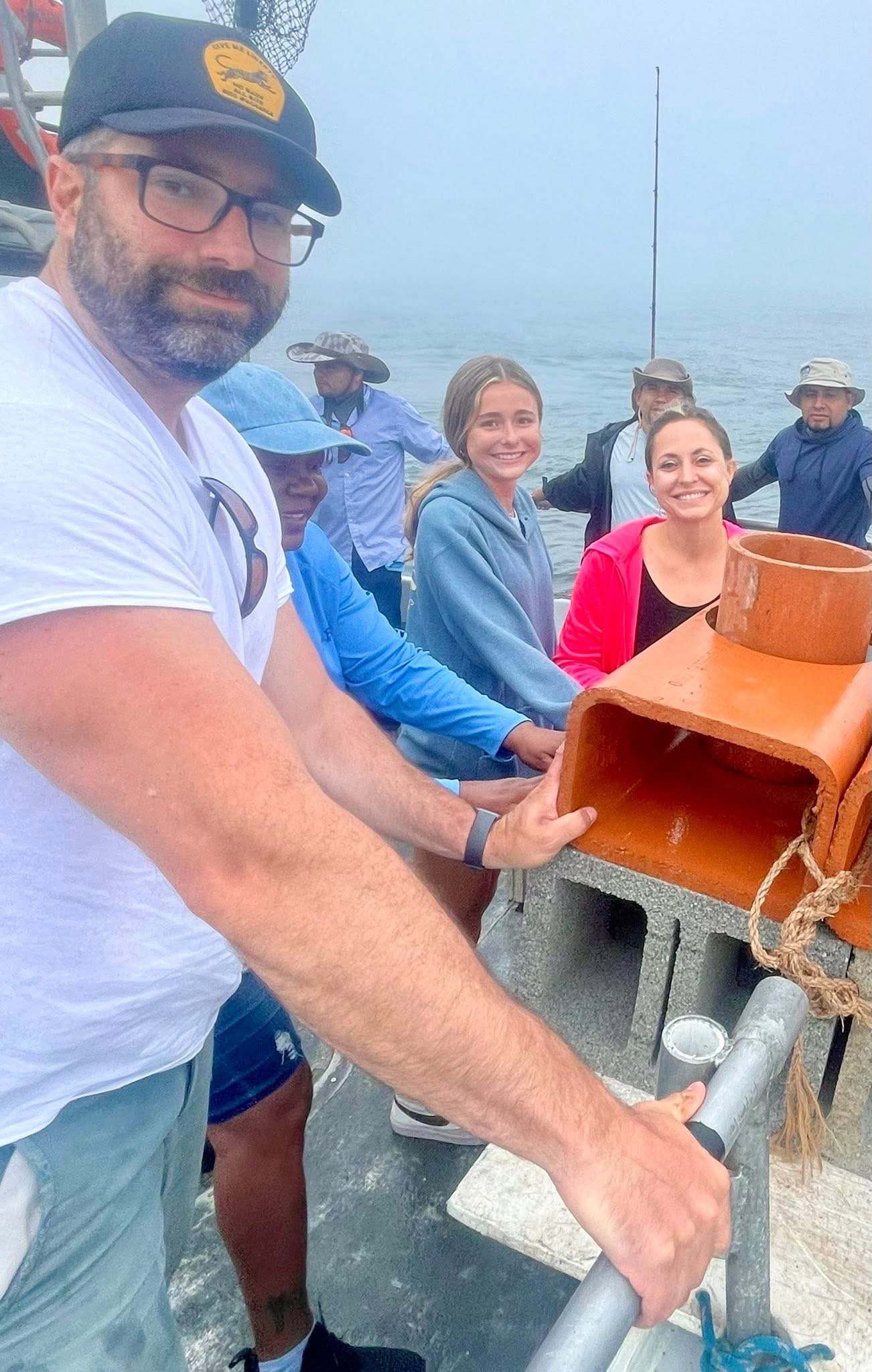 Radar, lookouts, a loud foghorn & running lights were my tools of the trade as we worked our way off to Crystal Ann Brinker’s Memorial Reef. Once there Jenny, Maddie, Theresa & Matthew made two perfect shots with a small terracotta unit and a stack of loose block