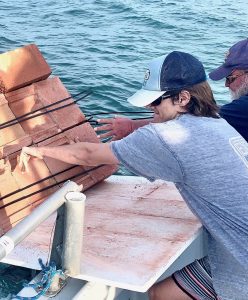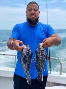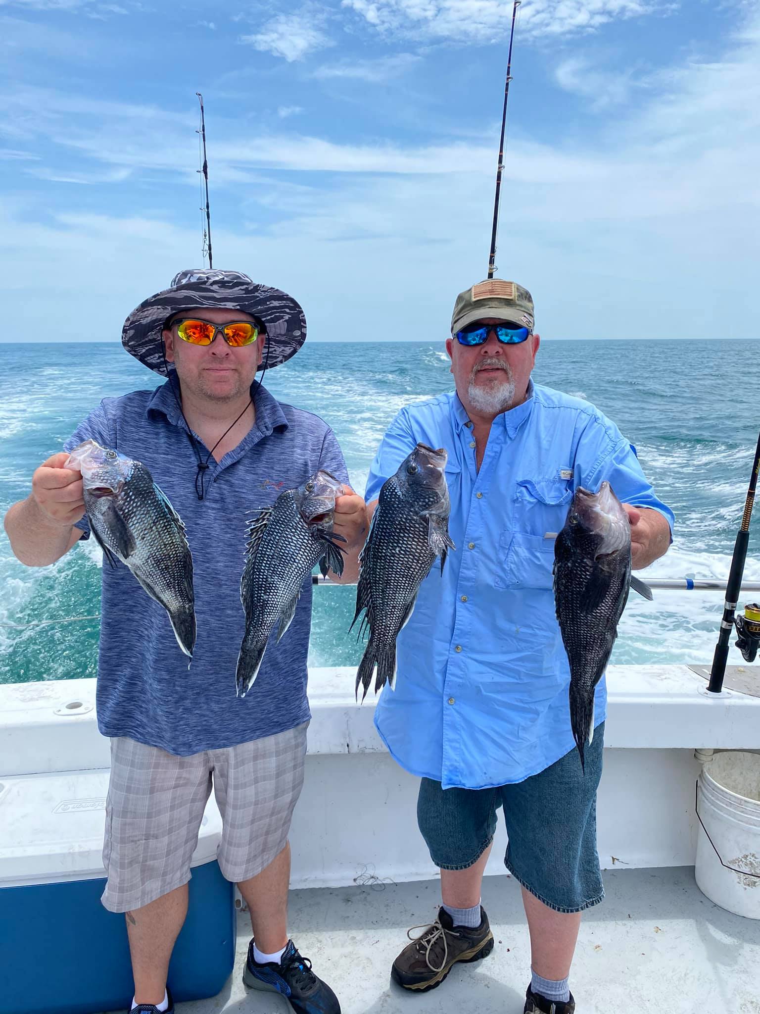 Another gorgeous day in paradise? Sure looked like it while clearing the inlet this morning. Ocean calm, hardly any swell from yesterday afternoon & evening’s wind; Finn Cook of Marshall VA & long time regular, Denny Cutcher, dropped blocks at Al Berger’s Reef North (making 809 blocks there.) We pressed on.