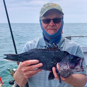 At our first spot you could see by the look in Flounder George’s eye some sea bass were headed for an oily hot tub.