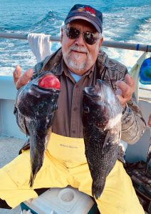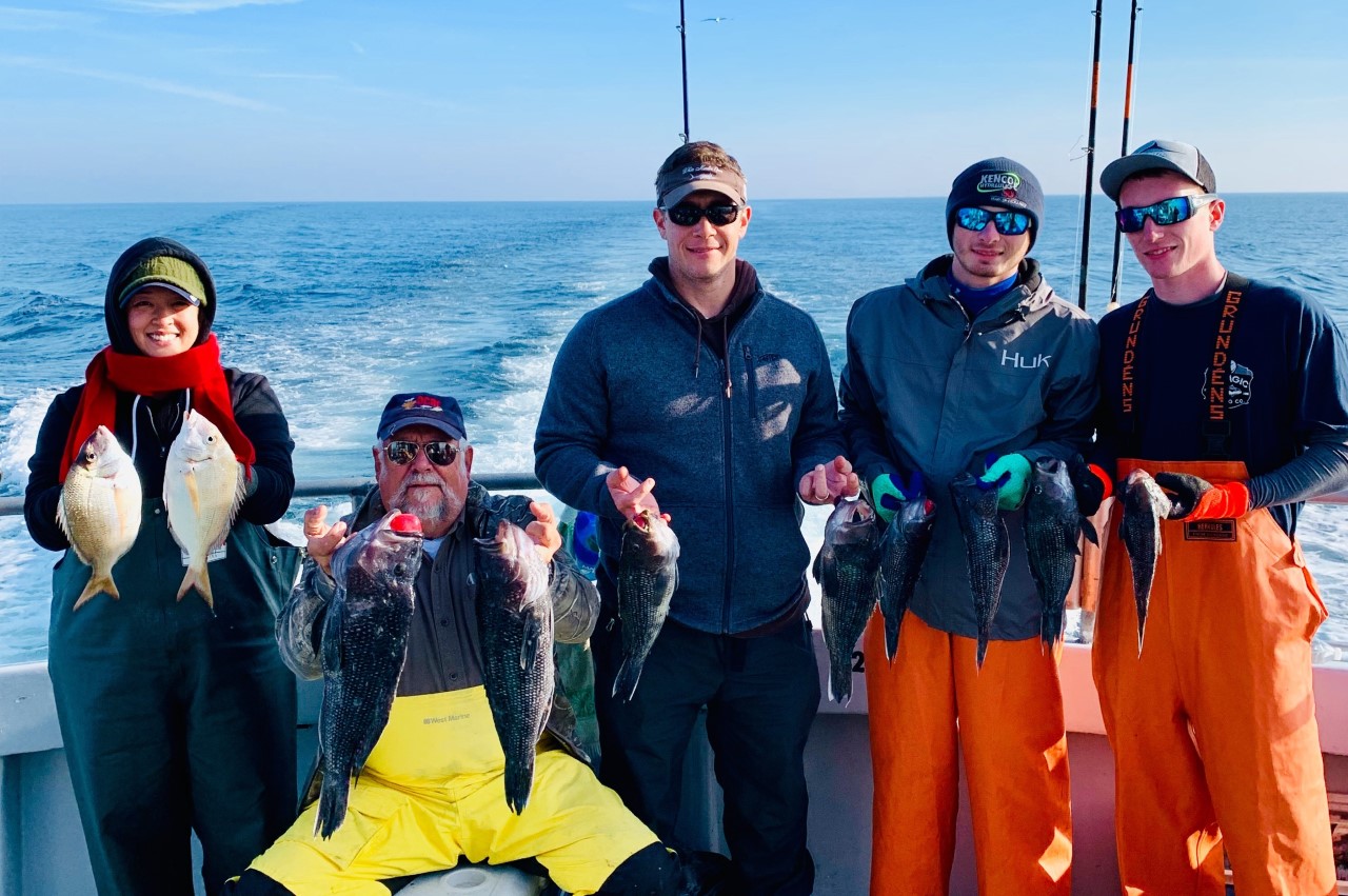 Andrew Dziengeleski of West River MD (blk sweatshirt) is holding up a keeper seabass with the largest pinfish I’ve ever seen. A southern species, we don’t see many to begin with.