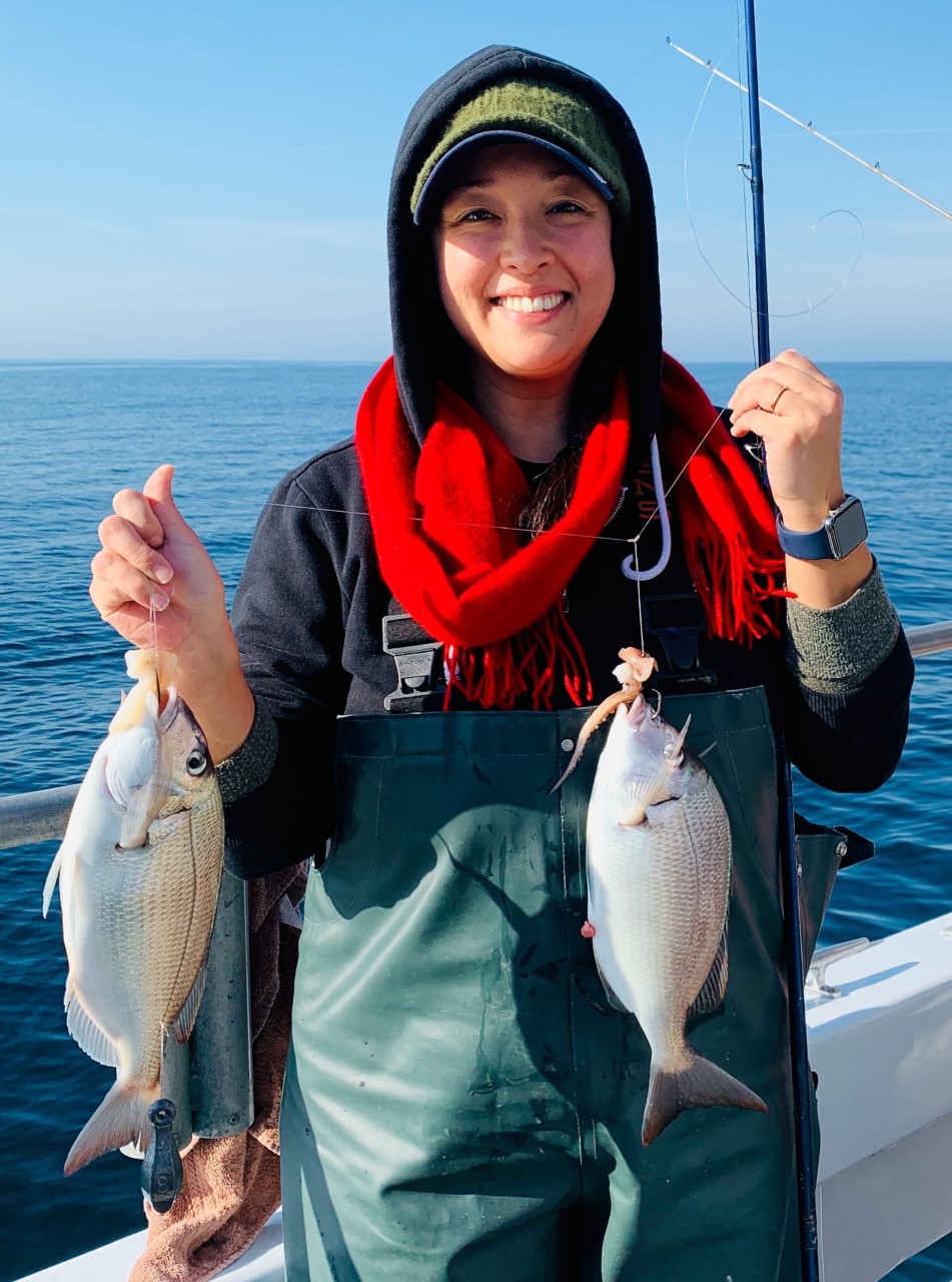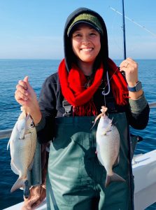 Stephanie Raha of Fairfax VA shows off a nice keeper double of scup.