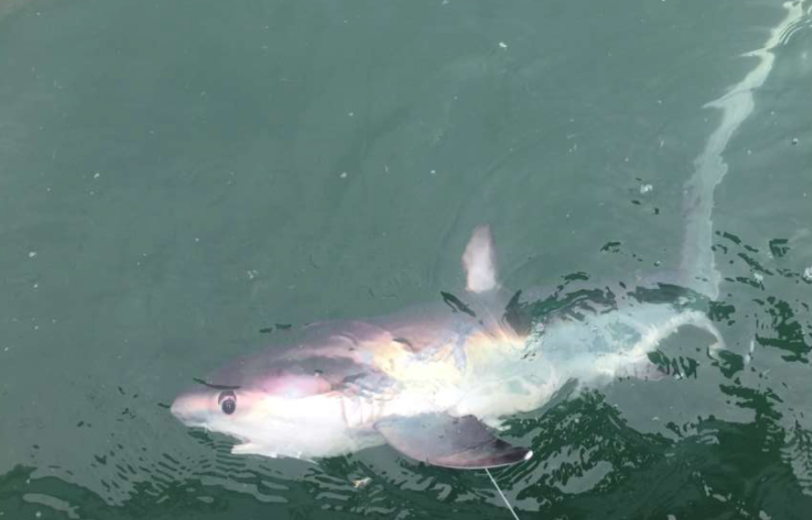 Captain Chase Eberle of Chasin’ Tide Charters had an inshore shark trip this morning where he put his anglers on a thresher shark just five miles off the beach. After a short fight the fish was released unharmed.