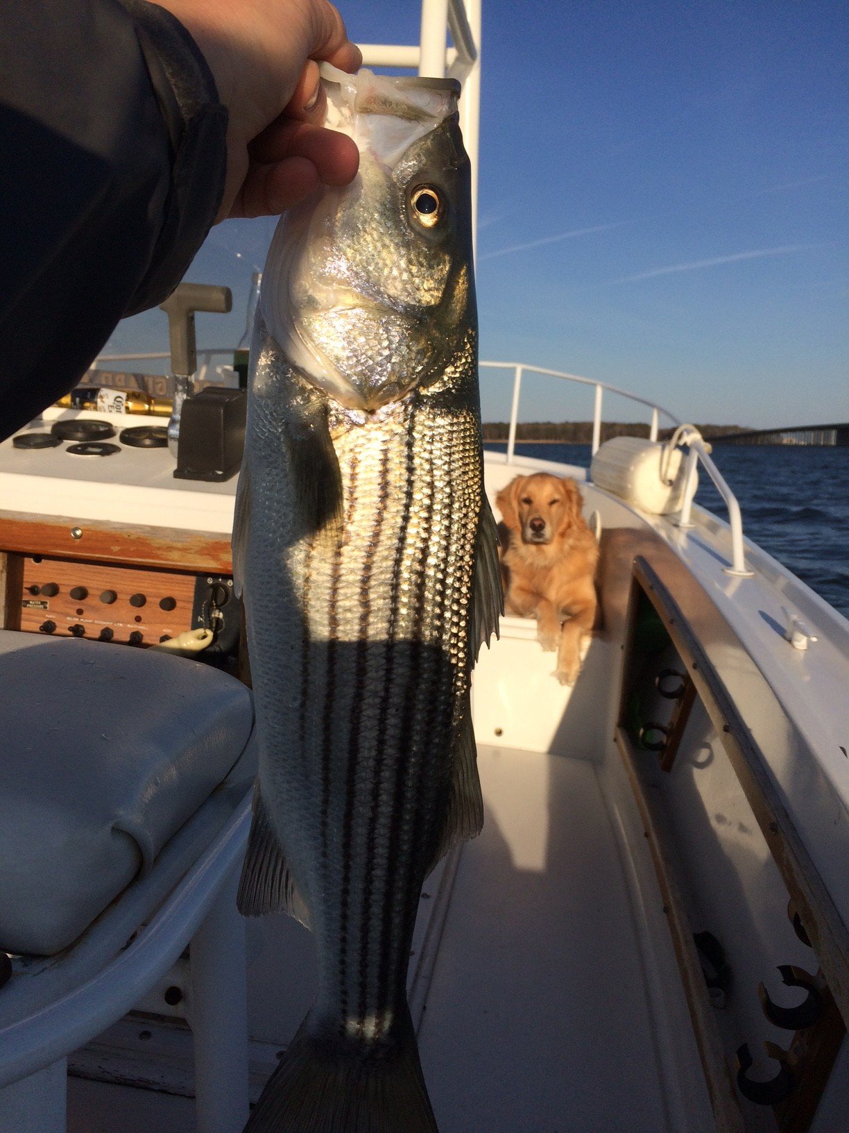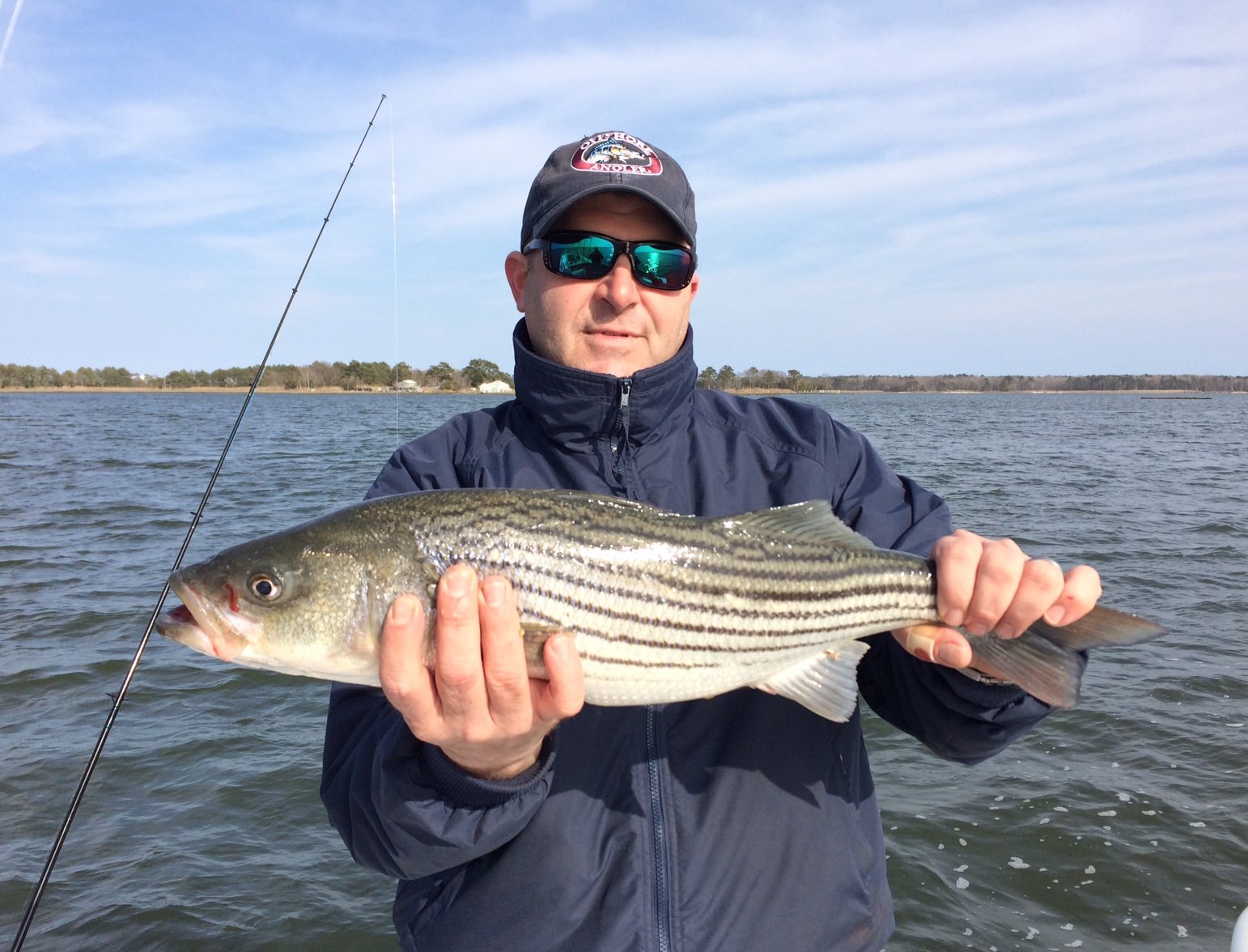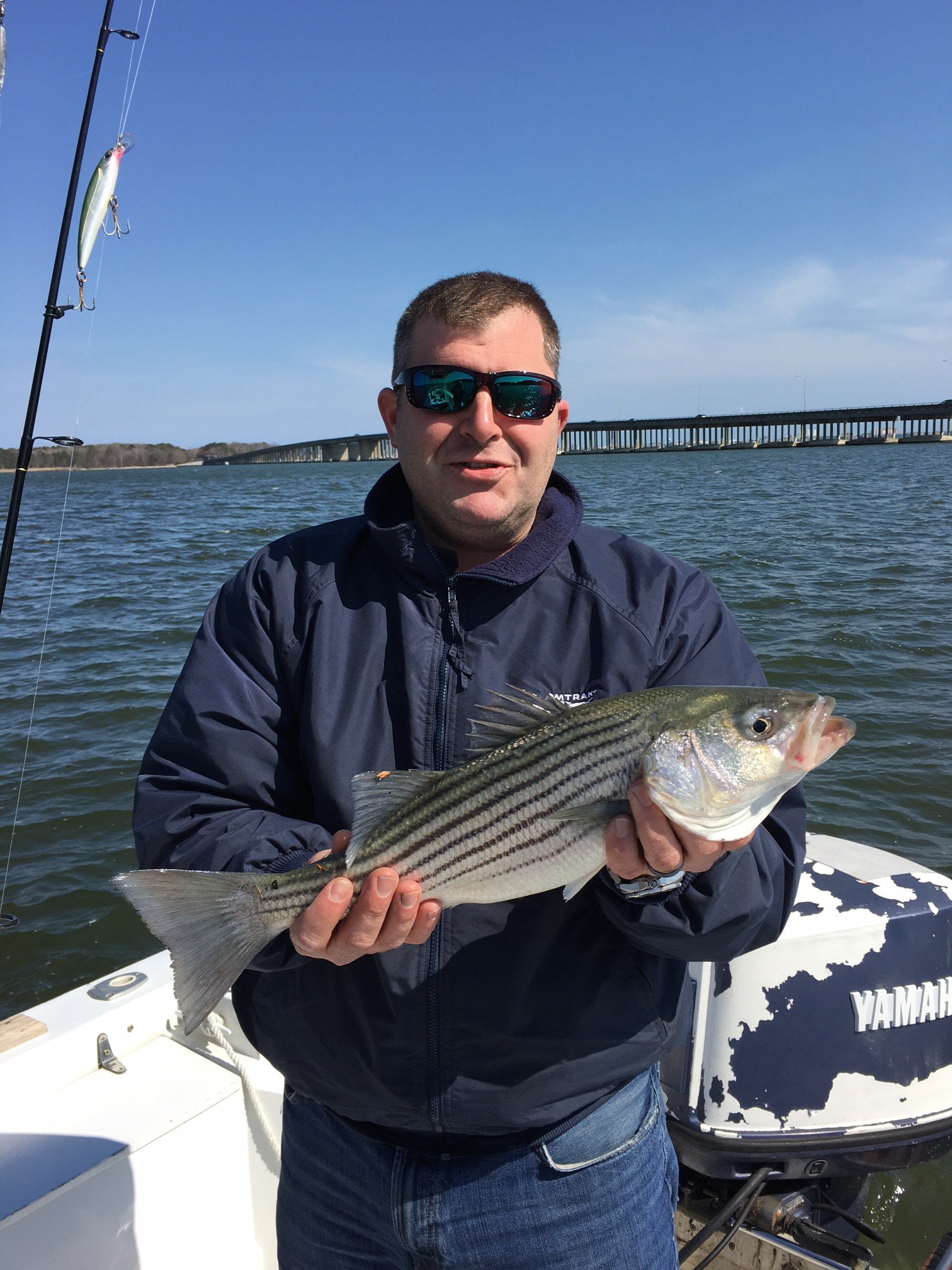 This was Saturday with my offshore fishing partner Rob Burton from Middletown, DE. Water was 55 degrees. First fish was 22″ and was caught and released by the route 90 bridge and the 24″ fish was caught and released in open water around the marshes across the river. We also caught and released two in the 14″-15″ size while trolling plugs around the bridge.