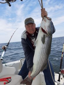 Rockfishing over on the Chesapeake Bay was good before this weeks wind started and should pick right back up after it’s gone. Merrill Eversman submitted this photo of his brother Ron Eversman of Salisbury who caught this 44″ rock trolling umbrella rigs last week at the gas docks in the Chesapeake Bay. Size limit in the Chesapeake is over 19″, coastal size limit is 28″ to less than 35″….I know….dumb.