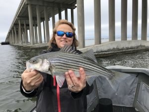 Like any good husband that got permission from his wife to go fishing yesterday Captain Jeff of Pitboss Fishing took his bride Karen out for some casting today. Captain Jeff was able to put Karen on some nice throwback rockfish action at the route 90 bridge while casting Roy Rigs.