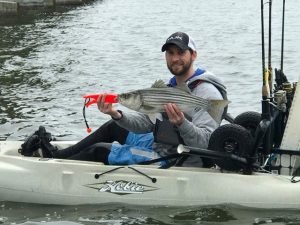 It was nice enough today for some more angling at the route 90 bridge where Captain Jeff Coats of Pitboss Fishing found some rockfish yesterday while casting Roy Rigs. Today Captain Jeff got a good shot of Ryan Willis who went 17 for 19 bites on rockfish while casting shad bodies from his kayak. The largest fish was a nice one at 26″.