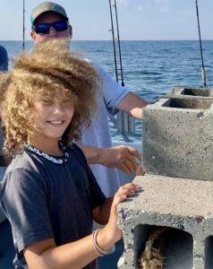 Today Chandler and David dropped blocks at one of the reef habitats I have invested so much energy in. Reef, for sea bass, is more often about evading predators. Man in a gray suit comes round? You won’t paint sea bass one on your sounders. They’ll all be as deep into the structure as they can get. Day like today? Forty or fifty feet of sea bass suspended off bottom feeding on tiny shrimp the current washed by. (Among the thinnest of ‘shellfish’ with krill and smaller/thinner still with zooplankton, here is where ocean acidification will strike first.. topic for another day.)