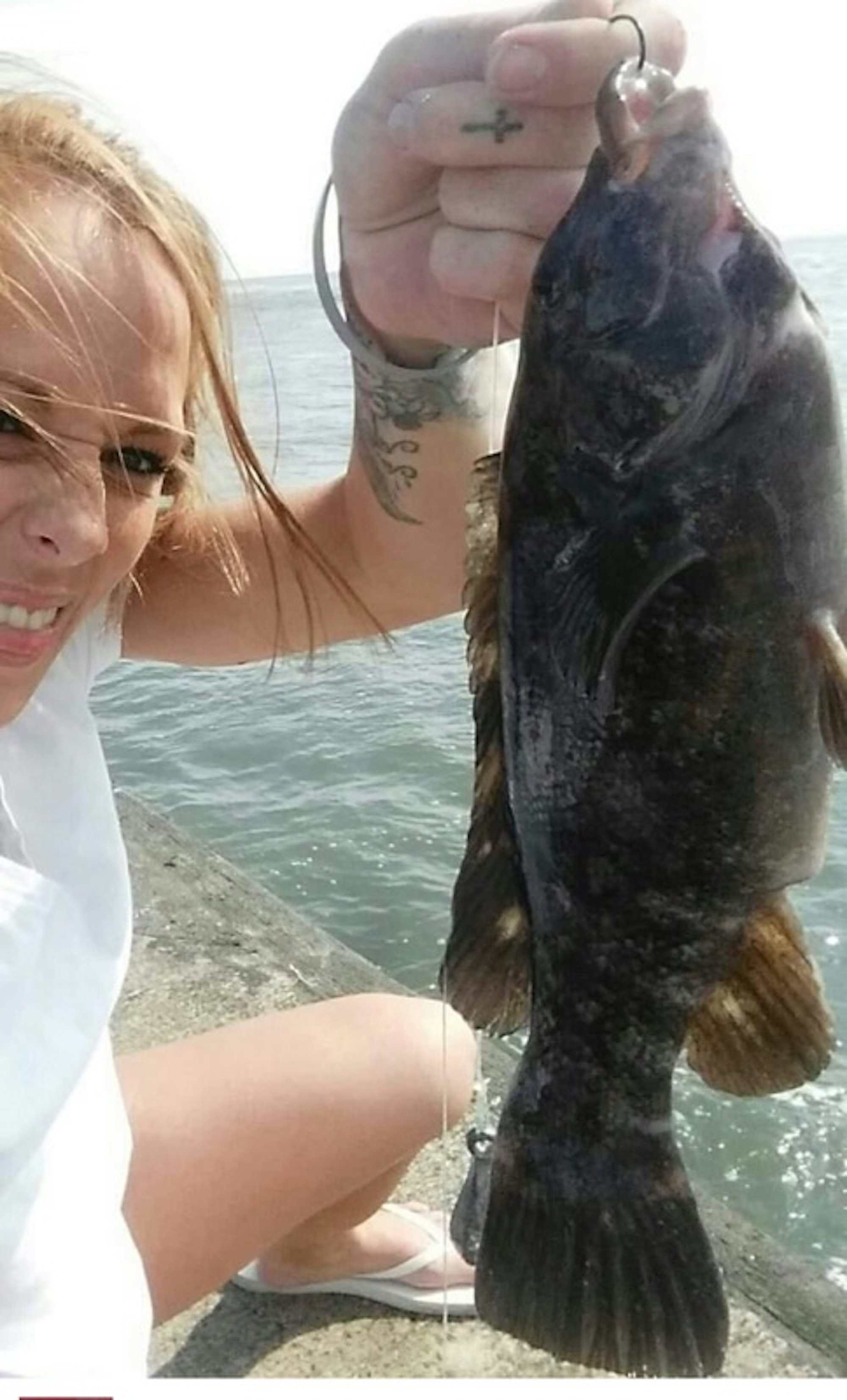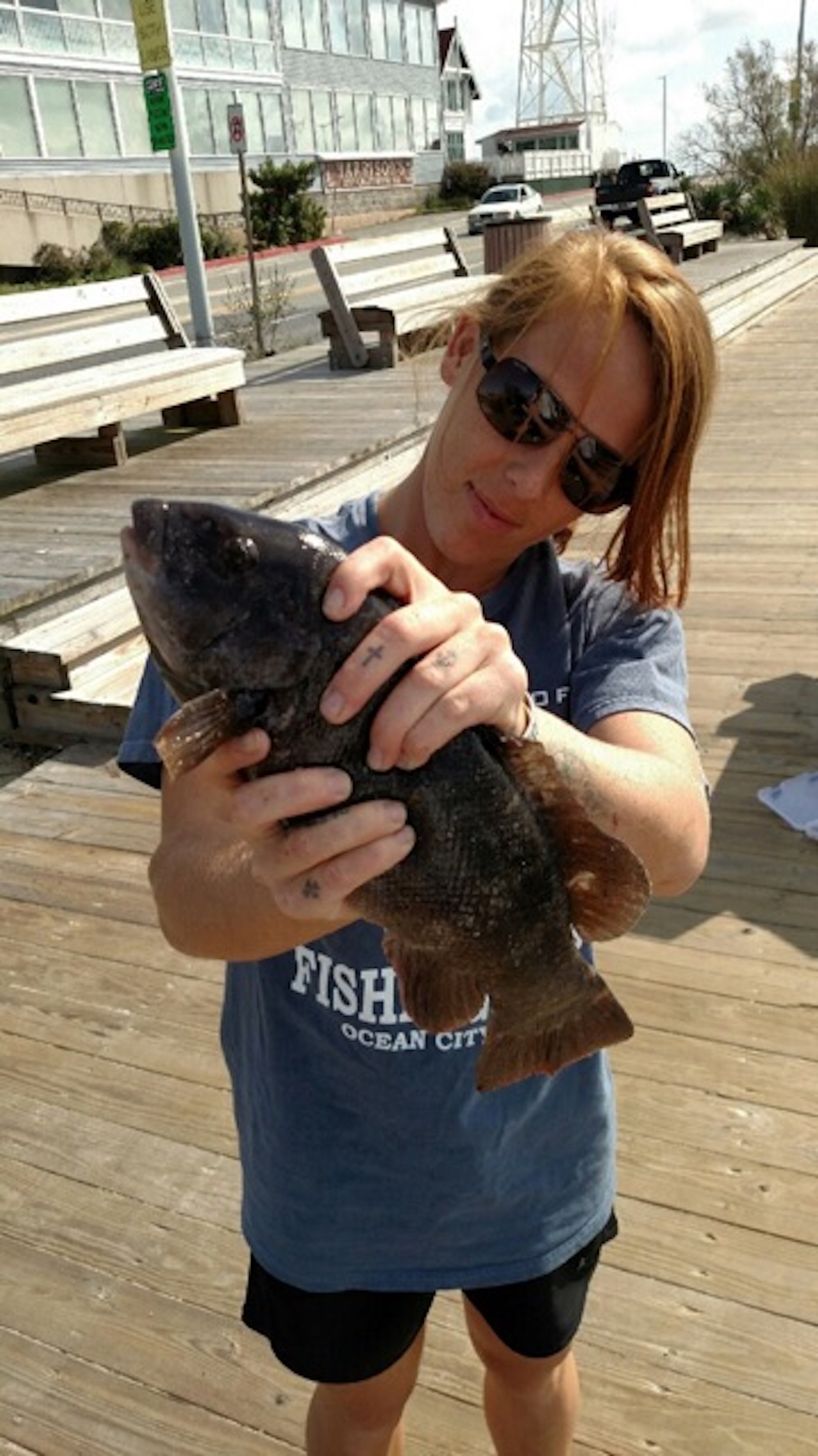 Amber Smoker has been “smoking” the fish from the north sea wall and getting Bear some great shots. Amber caught this nice 17″ keeper tautog on a sand flea today.