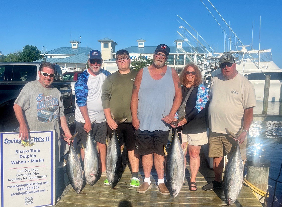 This group had an awesome day of trolling with Captain Chris Watkowski of the Spring Mix II. They were able to box five yellowfin tuna for the fish cleaners at the Ocean City Fishing Center.
