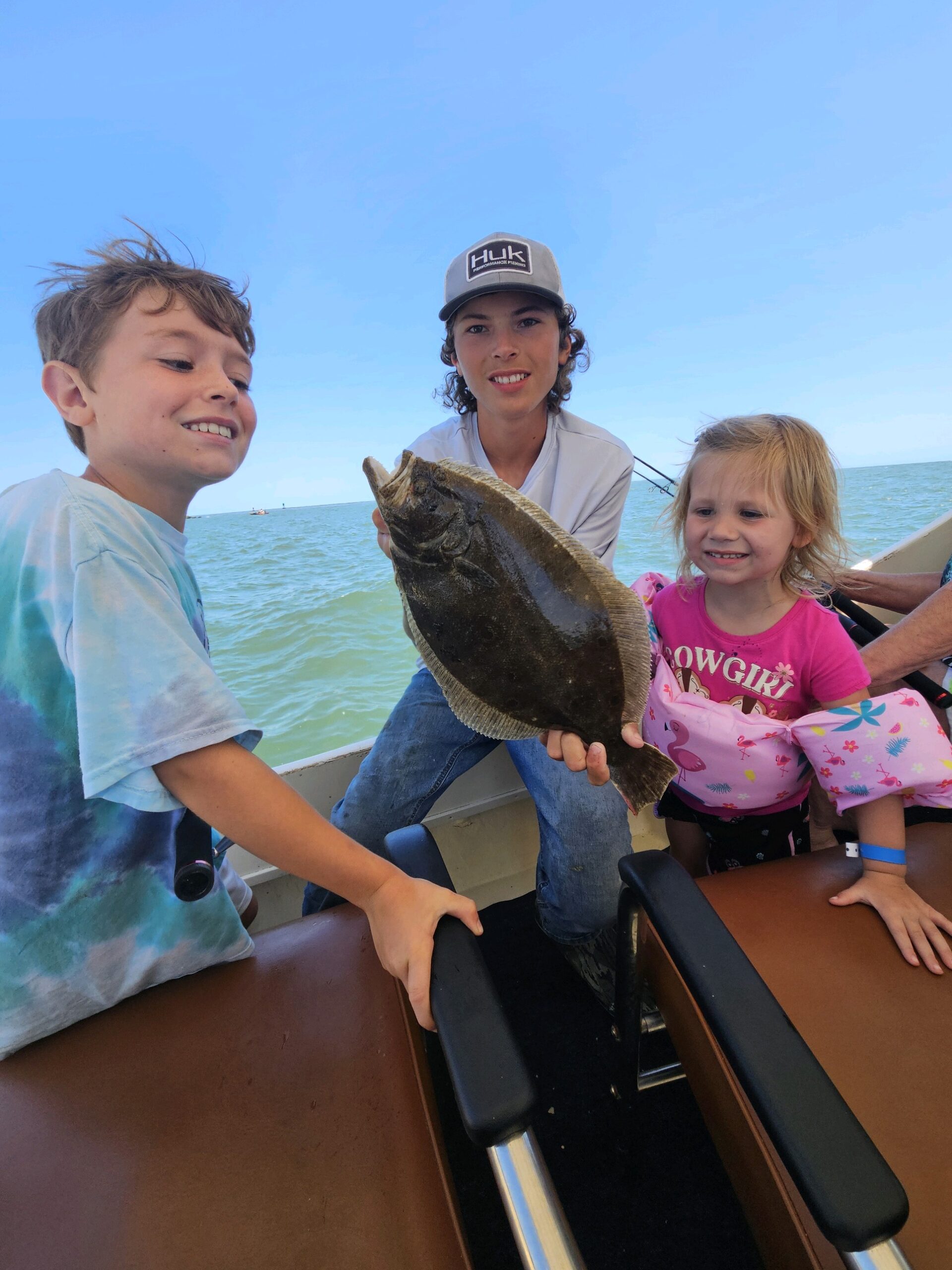 Hurricane threw in the towel and began flounder fishing – now daughter Kate, without a shred of malice, calls “net!” for a nice flounder..