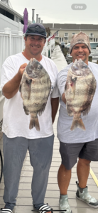 Jeff Weeks and Dave Weller used sand fleas to catch seven sheepshead in the OC Inlet, two of which were over 20″.