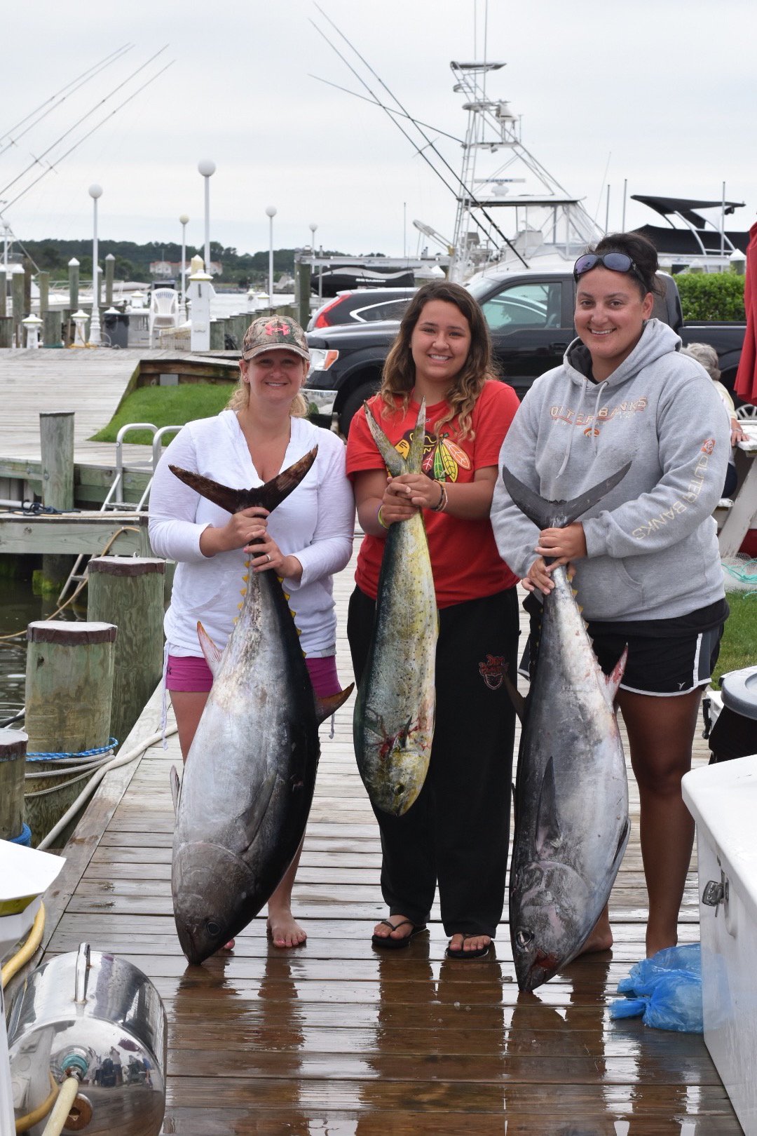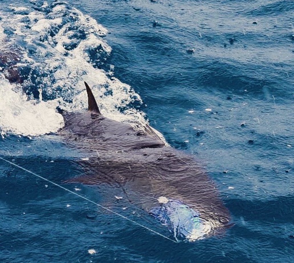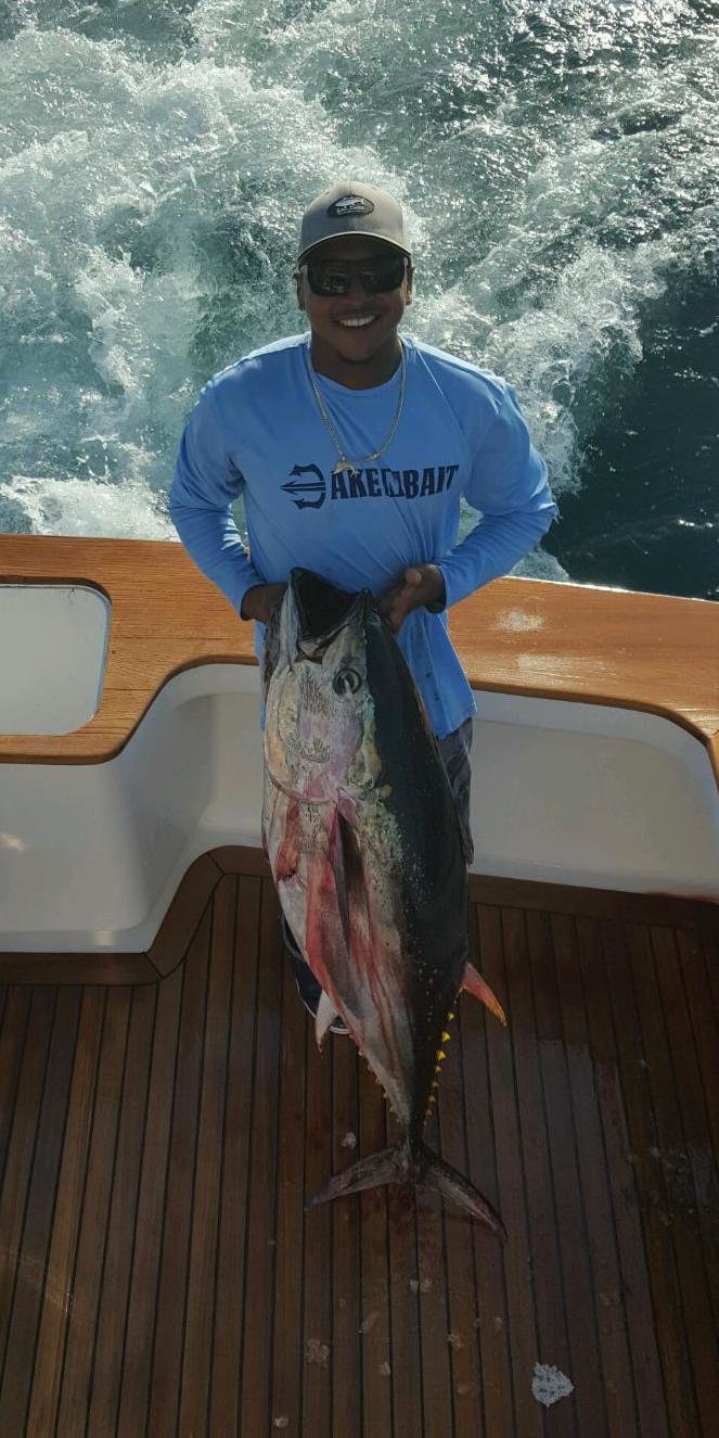 Captain Luke Blume on the C Boys out of Sunset Marina had a great day trolling the ocean today. The crew of C Boys combined for two bluefin tuna, a yellowfin tuna, a false albacore and a mahi. C Boys also caught a small cobia on the way back to the dock when Captain Luke spotted two of them on a turtle near the Little Gull buoy just off the beach. Mate John Henry rigged a ballyhoo and jigged it in front of them and the smaller fish took the bait. Captain Luke said the other fish was “huge” and estimated it to be pushing 100 pounds.