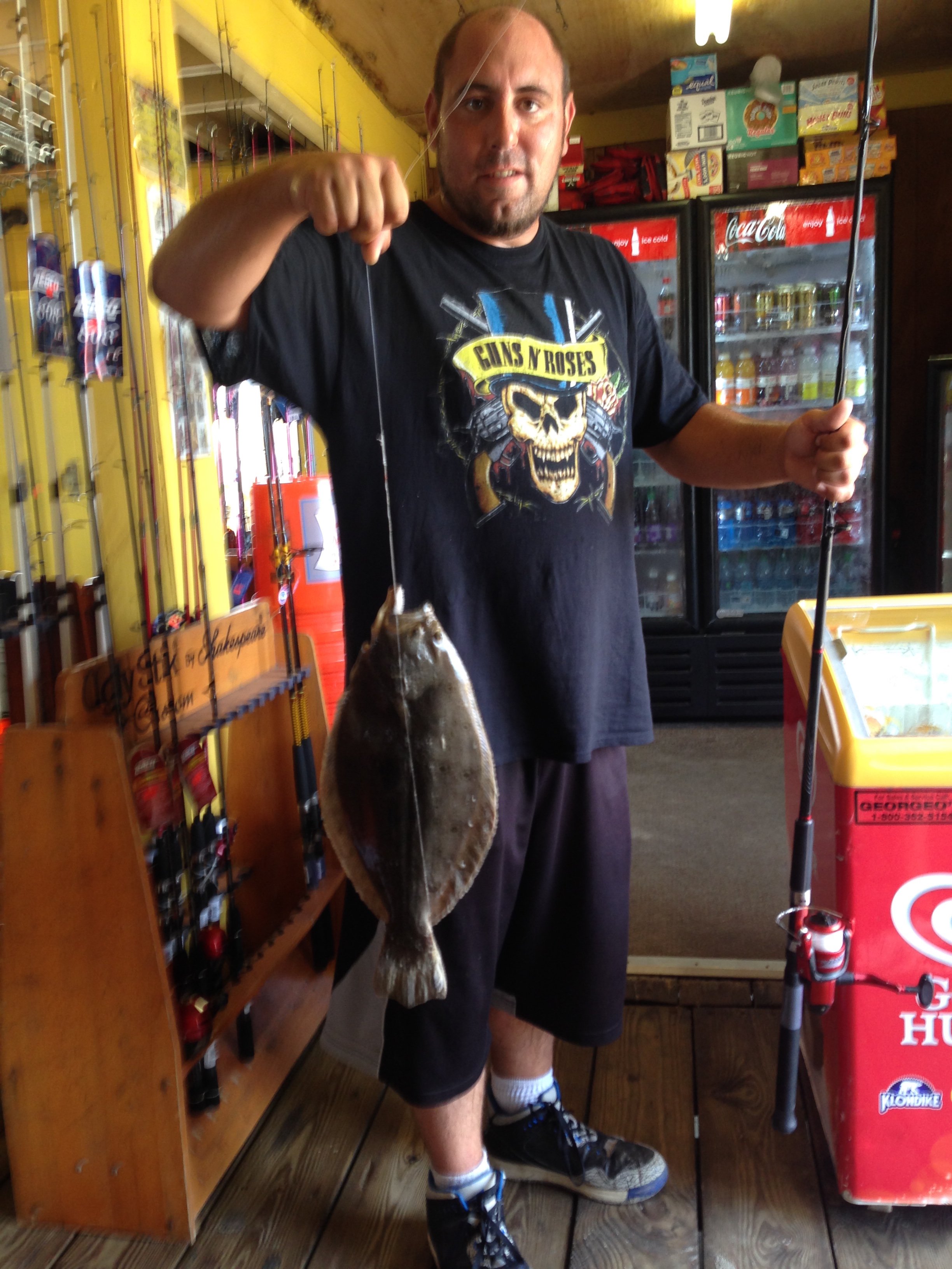 Bear at the Oceanic Pier reported some good flounder action this morning as well. Shawn from Reading, PA caught this 17 1/2″ flounder from the sea wall next to the Oceanic Pier on squid and “enormous” minnows from the pier.