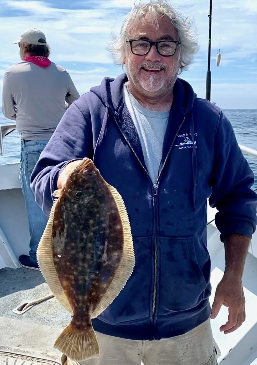 On the stern-side of my fluke anglers (to their right) was the reason I carry a few 4X life jackets – bringer of both mirth and heavy winds – our very own Prince of Portliness – man/myth/legend his dern self – Hurricane Murray hooked a long fat fluke on a sandflea.