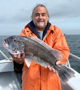 Now, old man Murphy, the guy in charge of making sure toast falls jelly-side down and rec estimates climb far higher than could ever be true; Murphy saw a perfect set up along my starboard rail today. A few anglers wanted fluke and were doing everything they could to target them. An old sea-dog fishing forward; Capt Chris was into double digits with nice sea bass & had already tagged a near DD blackfish/tautog/chinner/chiseltooth/tog when he boxed a decent flounder too – on a sea bass rig with a kitchen mop’s worth of squid. (Any fluke fisherman worth his salt will, if he must use squid, have a beautiful strip, perfectly cut, swimming enticingly behind the hook.)