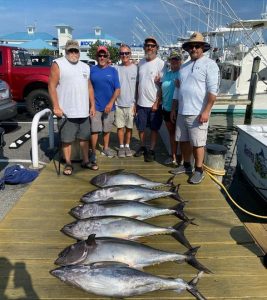 The crew of the Spring Mix II with Captain Chris Watkowski were very happy returning to the dock at the Ocean City Fishing Center with five yellowfin tuna from the troll.