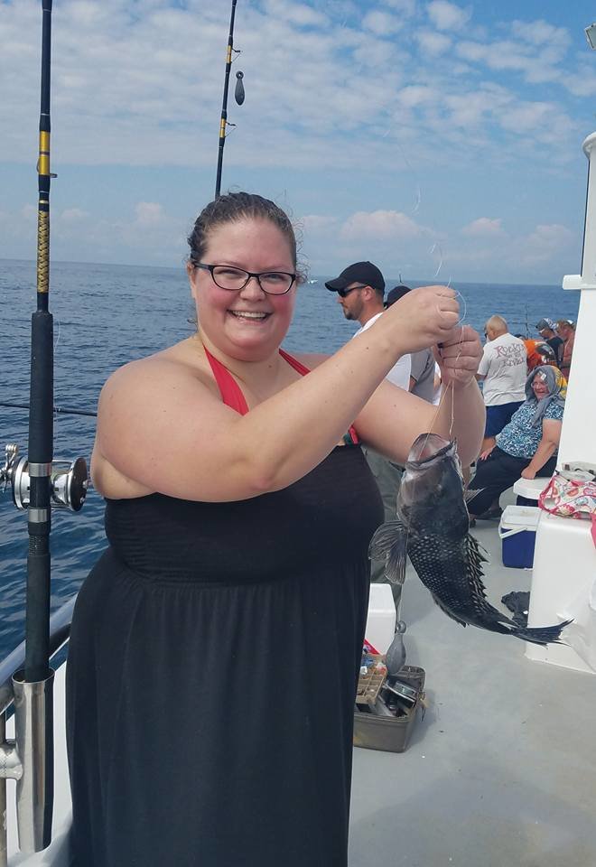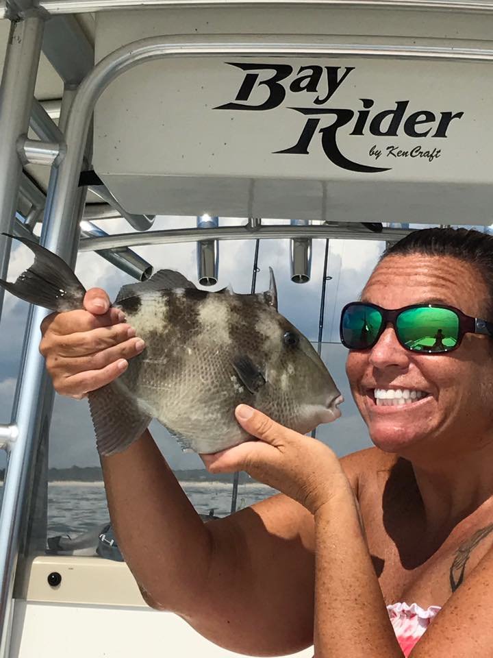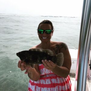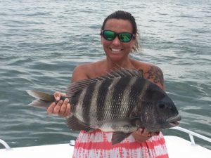 I got this Facebook submission from Tim Bunting with the report, “Holy Sheepshead!” and this photo of his wife Kelly. Kelly also caught tautog and triggerfish on the trip.