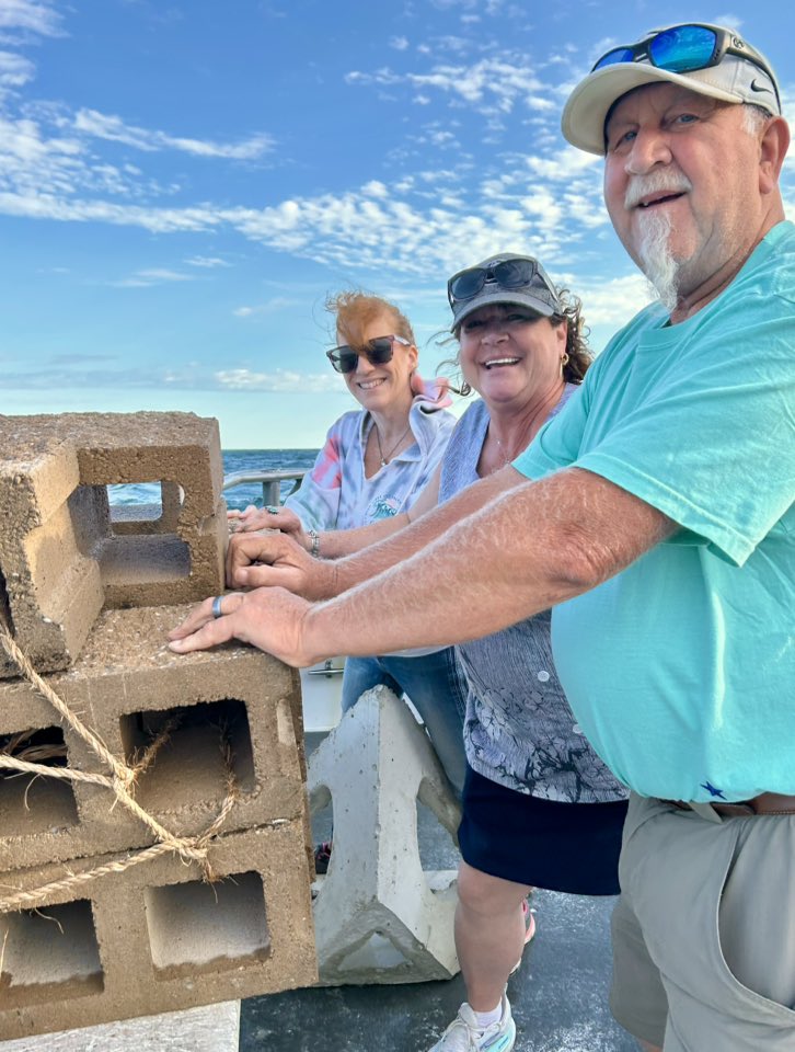 Mike, Joan and Misty did the deed on our reef blocks and pyramid today. Deployed em at new reef – makes 52 plus one pyramid.