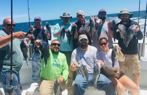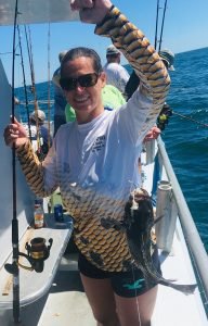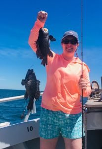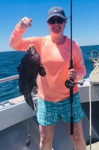Tyler Green of Queenstown MD took everyone’s pool money with his 19 inch sea bass. We had plenty of keeper doubles. Kristy Wheeler (orange shirt) of Arnold MD shows hers off and a single 18 incher – Tanya Zomostny Of Pasadena MD shows off one of her doubles (& here maybe mate Vance learned it’s important to get both fish in frame?) Bob Hauser of Carlisle PA shows off one of 4 keeper doubles.