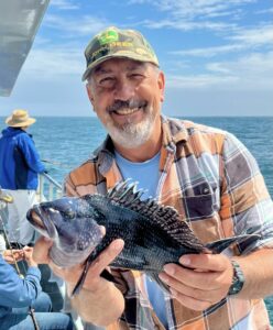 Our first client in double digits was was Brian (no doubt exercising his reef builder’s karma) at 10:50.. The bite did taper, however, as it often does, so limits were hard to come by. Still, Rick had the first limit at 1:15 while Jeff’s jumbo cbass put all other fish pool contenders to shame.