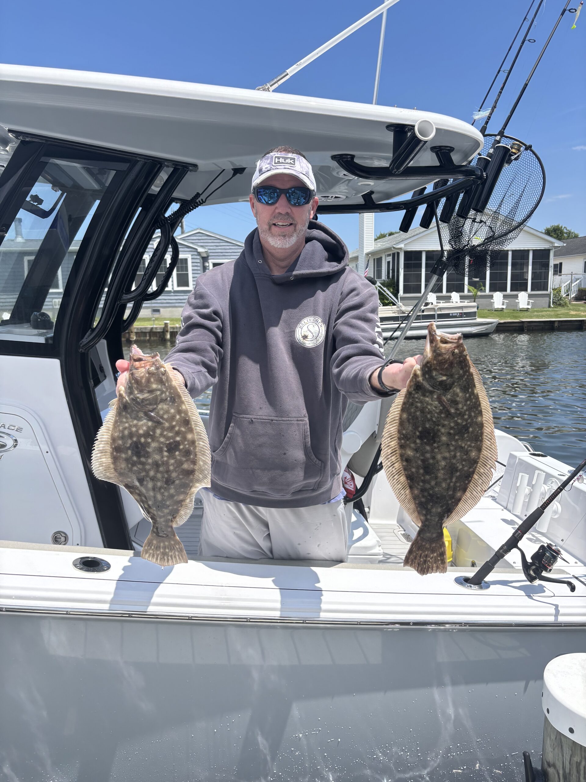 Jeff Beard used Deadly Doubles baited with white Gulp and shiners in the Thorofare to box these two keeper flounder of 18″ and 19″.