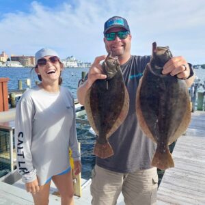 Chad and Hailey Barrick fished the Thorofare today with a combination of Deadly Doubles and Double Troubles and caught around a dozen flounder with three keepers of 18″, 19″ and 21″.