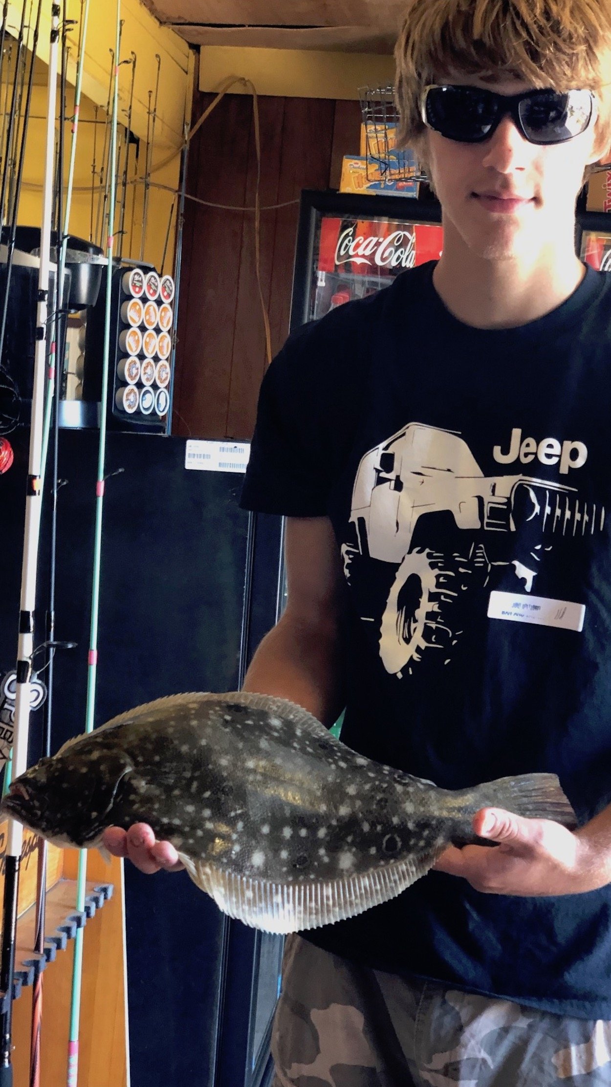 Bear down at the Oceanic Pier sent in this photo of Aaron who used a white Gulp to land this 20″, 4 pound flounder.