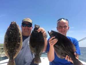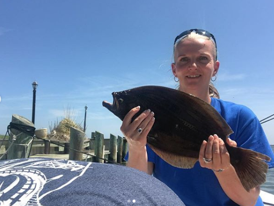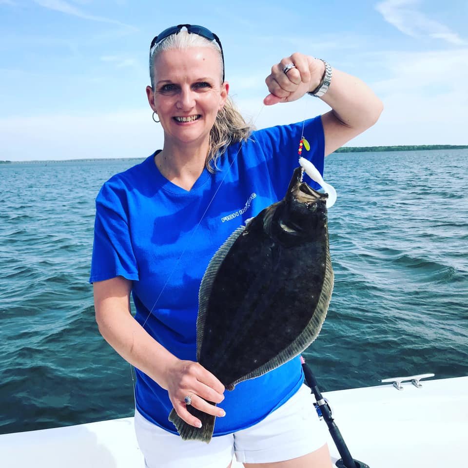 My wife Kristen and I decided to hit the Thorofare this morning to take advantage of the awesome flounder bite that has been going on there and we were rewarded with some really good fishing once again. We got there about mid-outgoing tide, but the water was still nice and clean and it was 60 degrees so we figured we might have some luck. The wind was blowing hard enough out of the west to give us a drift at more than one knot so we decided to let Mother Nature take the wheel. We only fished for about 2 hours and found success with both chartreuse and pink Fish in OC Deadly Double rigs with 4″ and 5″ white Gulp. I had two keepers of 17 1/2″ and 18 1/2″ and Kristen had a nice 19 1/2″ fish. We also released another 9 fish, four of which were 16″ or better.