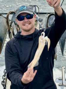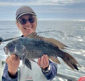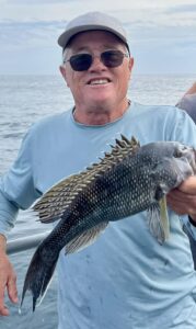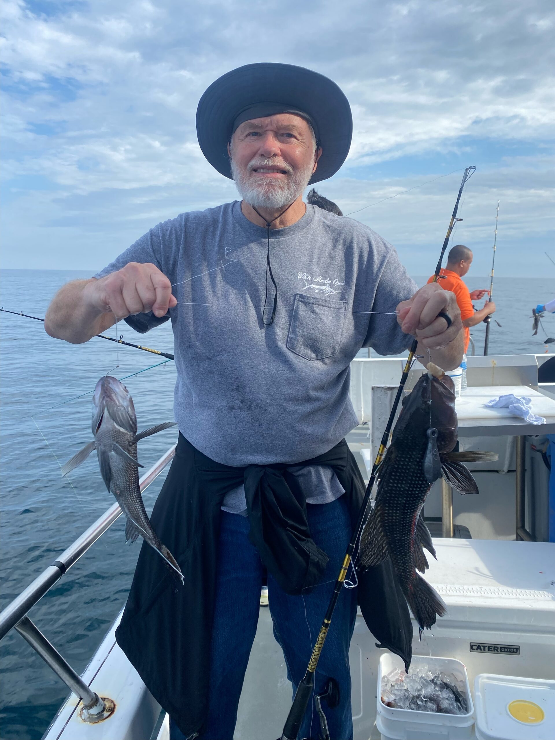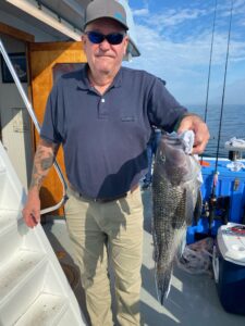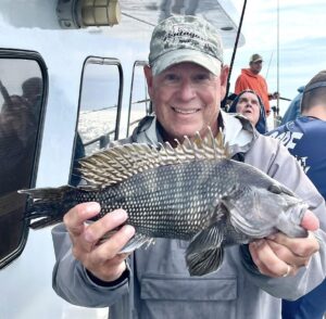 We found sea bass more cooperative than usual of late. George (who usually has his young sidekick, Tyler, with him) was limited on sea bass at 11:50. My long time friend, Wayne – who so appreciates the cancer medicine ‘Keytruda’ for extending his life after being told he had scant months to live & is now beyond quadruple that and fishing hard; Wayne was first into double digits. Nearly everyone crossed that mark as well.