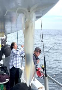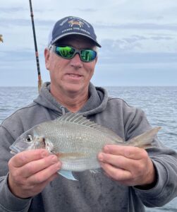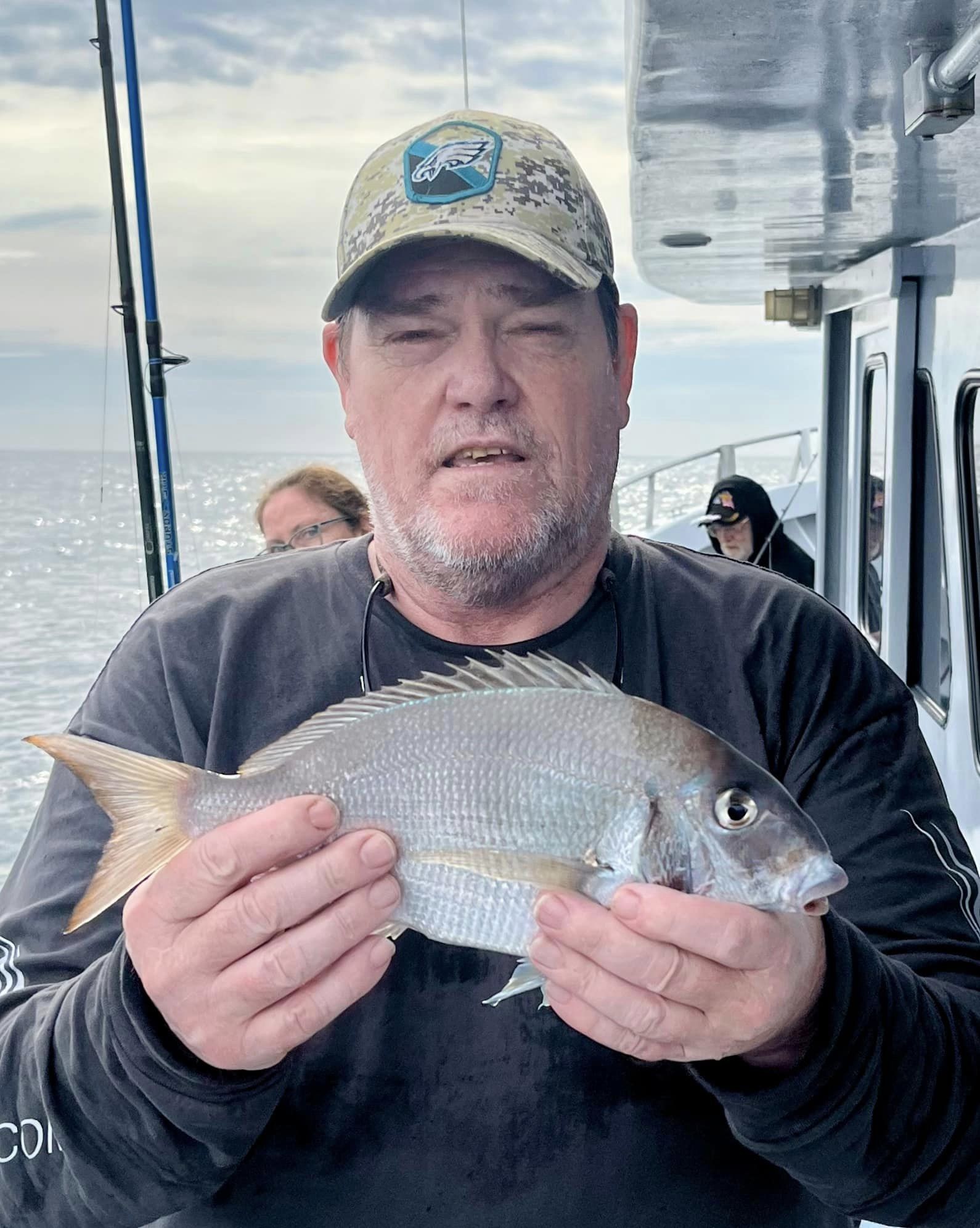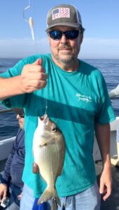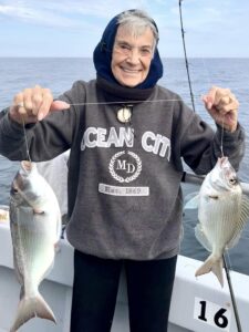 I suppose the real story today was scup/porgy. Into the late 1960s scup likely represented over half of Ocean City, MD’s recreational bottom fish landings. After decades of absence, nowadays we generally see them in early winter. This year? Derned if we didn’t start seeing scup a few weeks ago. I think today I could have fairly well hammered them with scup rigs. Must have been terrible weather up north to have driven them south so soon. (Same reason bft are hanging around?) High hook on scup was Bo with six good fish.