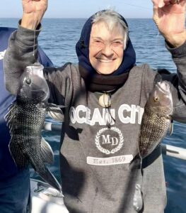 Sandra, half of Chincoteauge’s dynamic duo of serious lady anglers, boxed today’s pool winner.