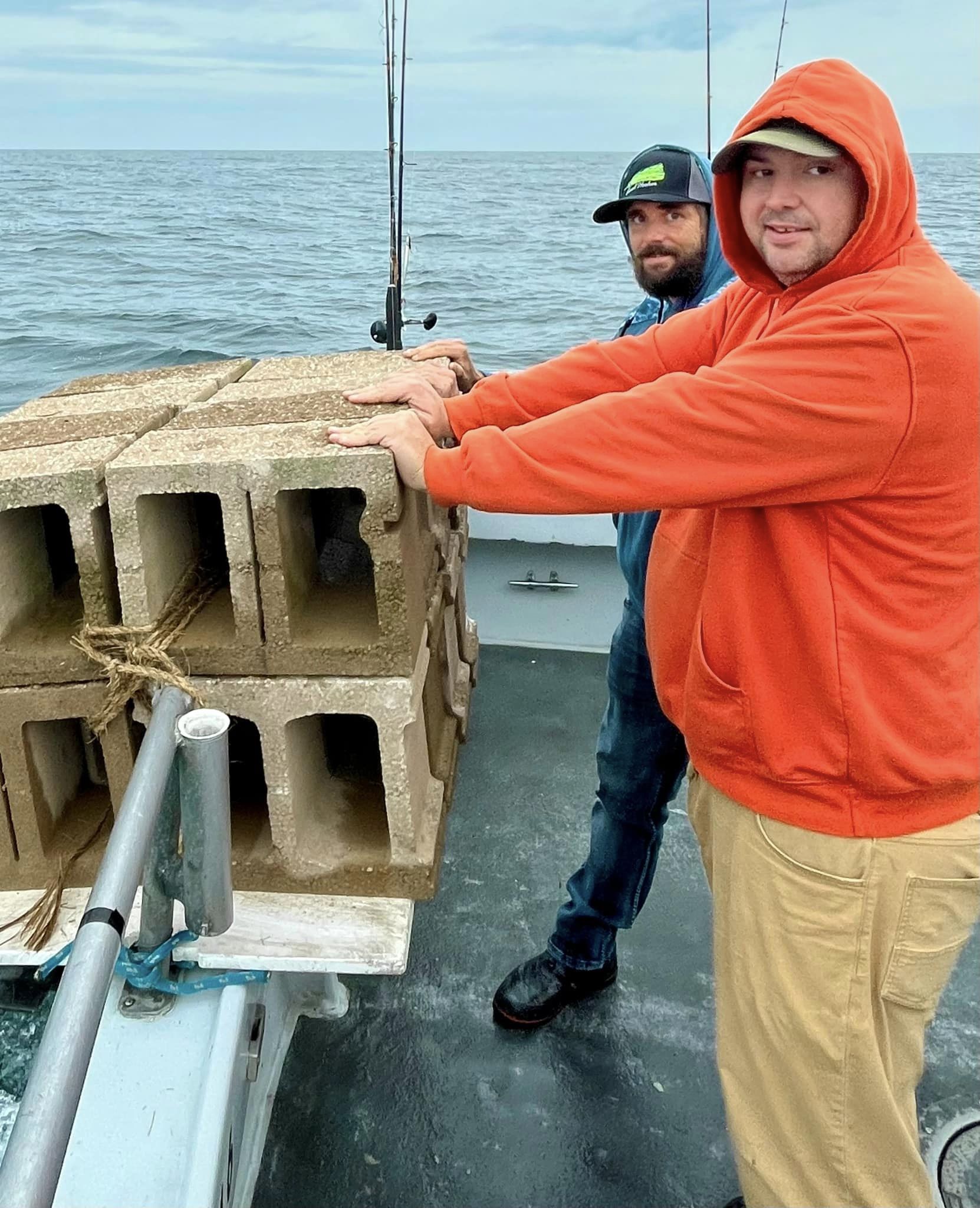 After paddling off a good way, Peter & Chris were our guest reef builders today. They dropped blocks on another experimental reef where, despite very little structure, I marked the heck out of sea bass. (Hope we didn’t squish any..)