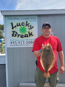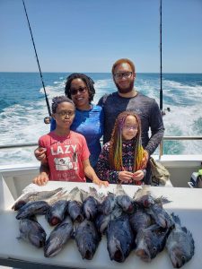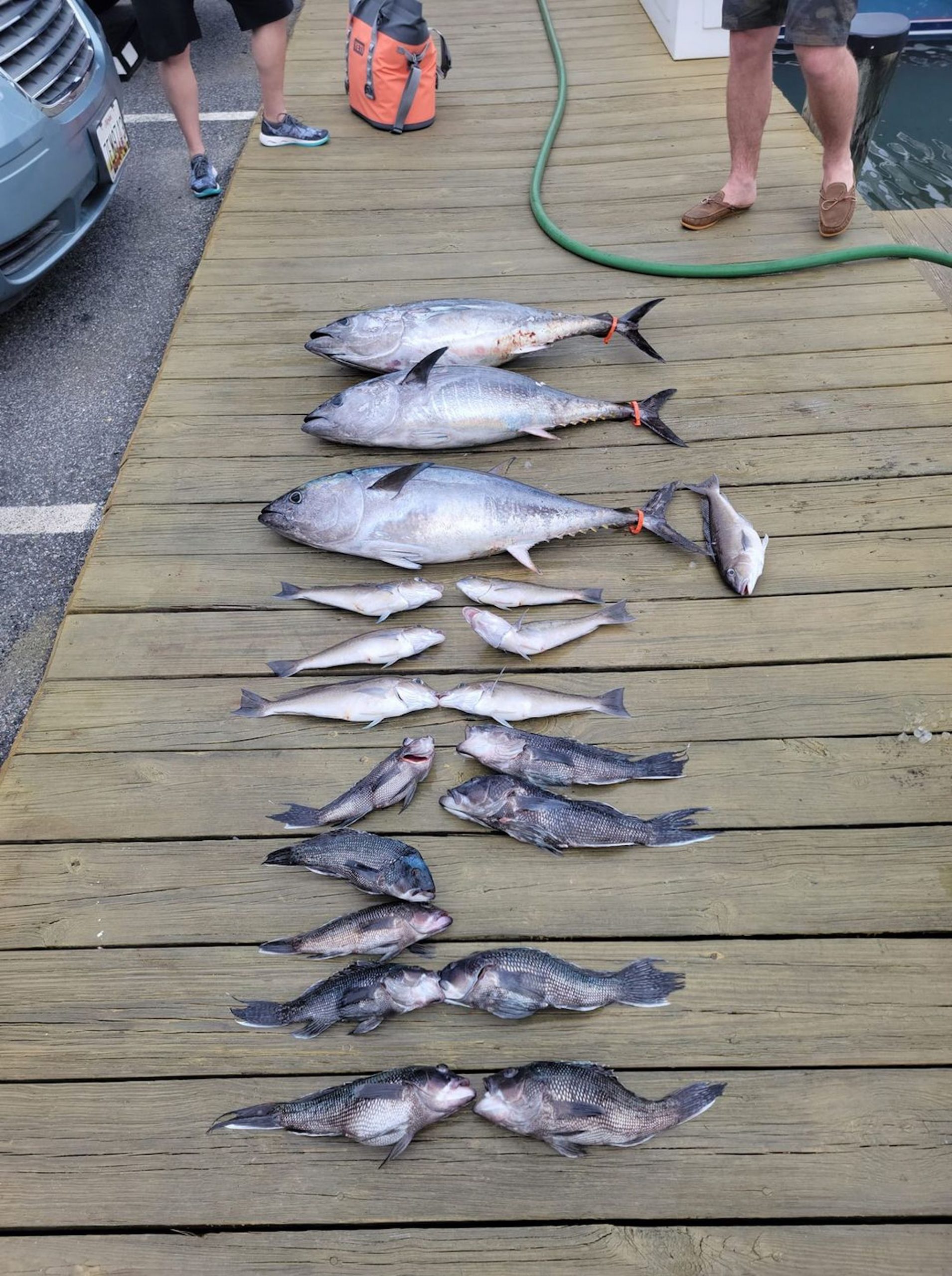 Captain Chase Eberle of Chasin’ Tides Charters had an offshore trip today that was very productive for his anglers. Captain Chase put his crew on five bluefin tuna up to 43″, a limit of blueline tilefish and about 20 keeper sea bass. Another crew was one for one on bluefin tuna and also released a 62″ mako shark.