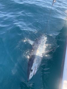 Captain Chris Watkowski of the Spring Mix II had his anglers three “under” bluefins by 9:30 this morning and released another six fish before they went shark fishing with no luck.
