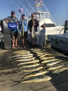 Offshore fishing was pretty good around the marinas today with more white marlin being released, a bunch of mahi being boxed and some more tunas showing up as well. Captain Chase Eberle of Chasin’ Tides Charters had a nice trolling trip today that produced 26 mahi and yellowfin tuna of 46 and 74 pounds.